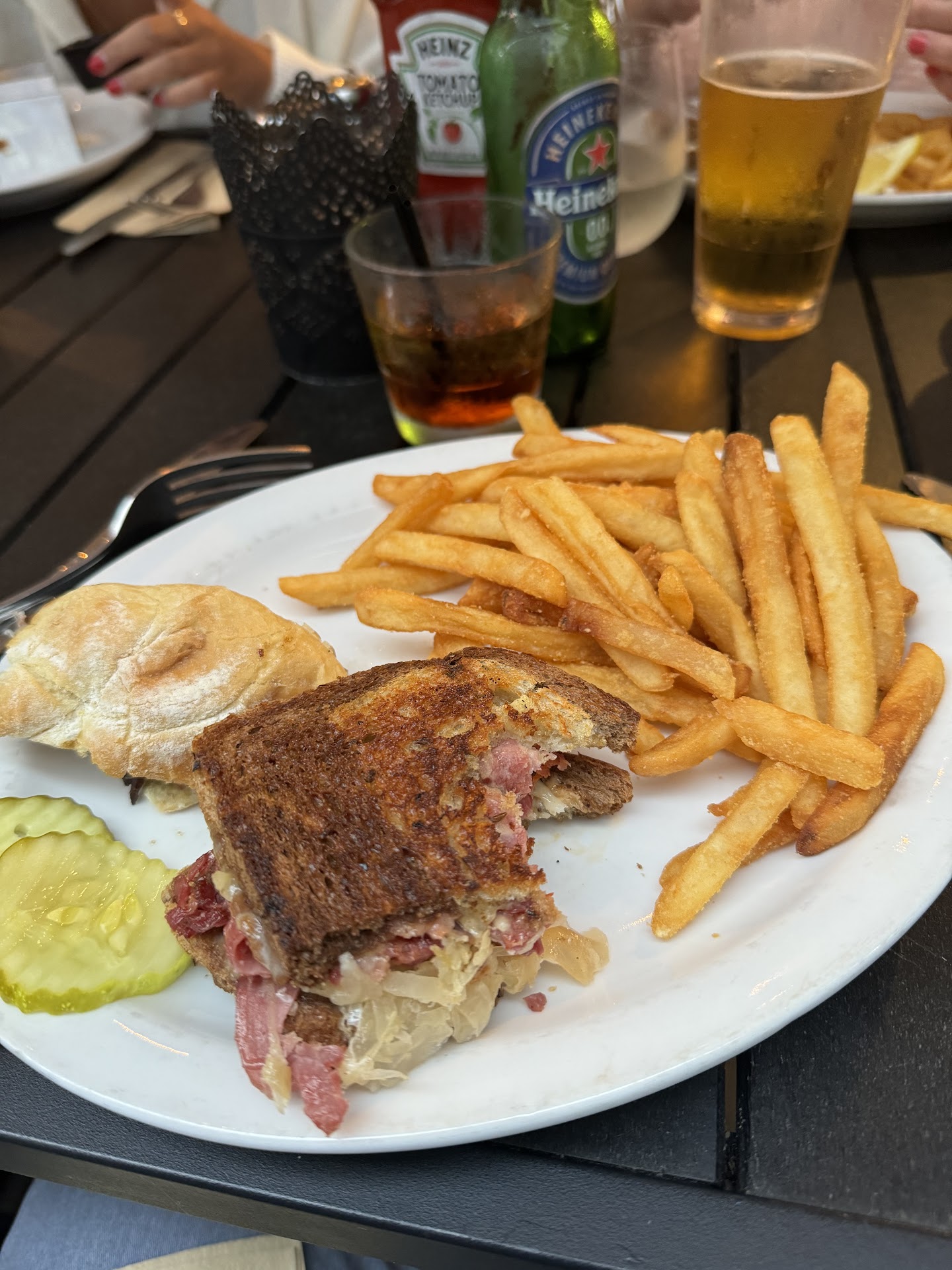 I'd note that my veggie burger was delicious, slathered with mushrooms and swiss and between a yummy almost focaccia like bun. My partner's reuben was above average but his fries were cold.