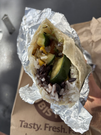 Burrito Bistroâs website proclaims, âTasty. Fresh. Fast!â and I have to agree with each of those adjectives. Their colorful storefront having caught my eye on a recent visit to Mashpee Commons, I decided to check out the reviews and subsequently stop in the following day to try their B2 burritoâa substantial meal in itself (I ordered the largeâitâs nice that they offer several sizes)âthe vegan version. My order was ready quickly and I marveled at its heft as I lifted the bag and sat down outside to enjoy my meal. The unadulterated, perfectly cooked base of black beans and Jasmine rice was a refreshing change from greasy, salty mixes Iâve had in other establishments. Both the legume and the grain tasted like there were no unnecessary oils or seasonings added to the cooking process. Instead, the flavor came from the chargrilled vegetables scattered throughout: perfectly cooked meaty chunks of mildly sweet and crunchy carrot, corn, zucchini, and onionsâjust like the rice and beans, there were no additives to the veggies; they were garden fresh and naturally tasty. I paid extra for Salsa Fresca and guacamole; however, unlike the rest of the ingredients, the portions of these were minimal and all amassed at the bottom of the burrito. Service was goodâemployees were friendly and responsive; however, the employee taking my order had an earbud in one ear, which she had to remove so I could repeat my question when I came up to the counter a second time. Although I didnât expect it to be, the burrito was not authentic Mexican; however, it was fresh and flavorful and I would definitely return for another next time...