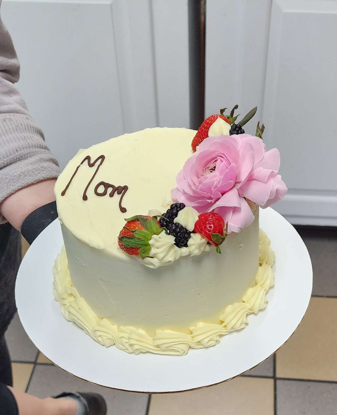 The cake I got my mom was divine; it was chocolate with a chocolate mousse(?) filling and buttercream frosting, and it was to die for! The cake was soft, the mousse was silky and tasted both chocolatey yet different from the chocolate cake parts, making the taste throughout interesting and never "too chocolatey", and the buttercream frosting was thick and wonderful! The berries were fresh and flowers beautiful.