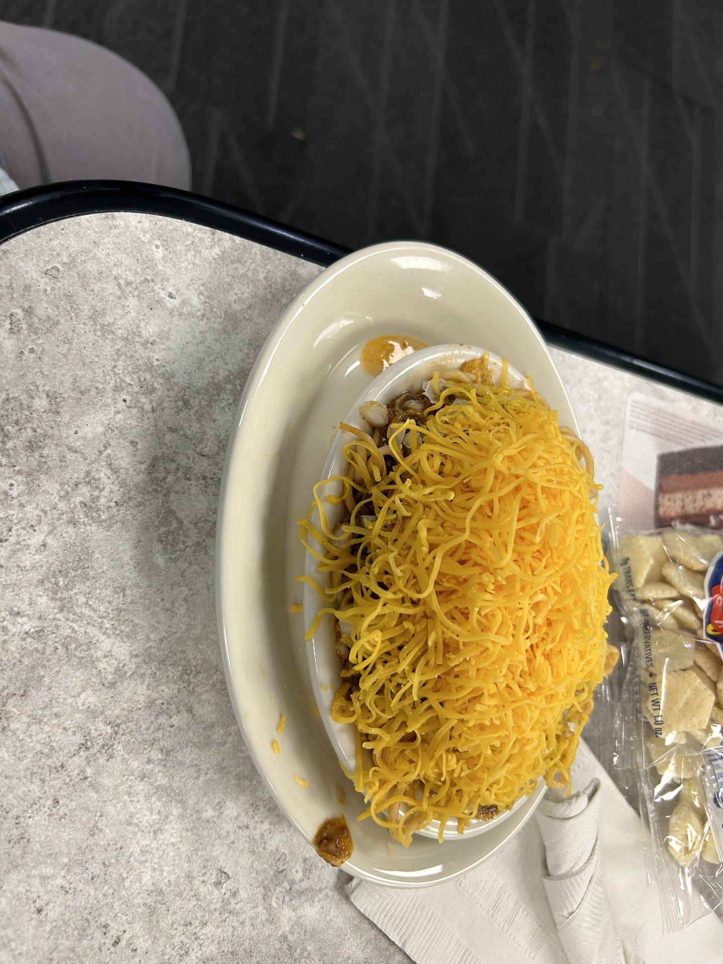 And these are small orders. A regular 5-way, a small 5-way, and a Greek salad. The most egregious example was a large order for seven hungry people coming back from KI. We reached home with nine (NINE) random chilis, cheese for five, and, once again, too few onions.