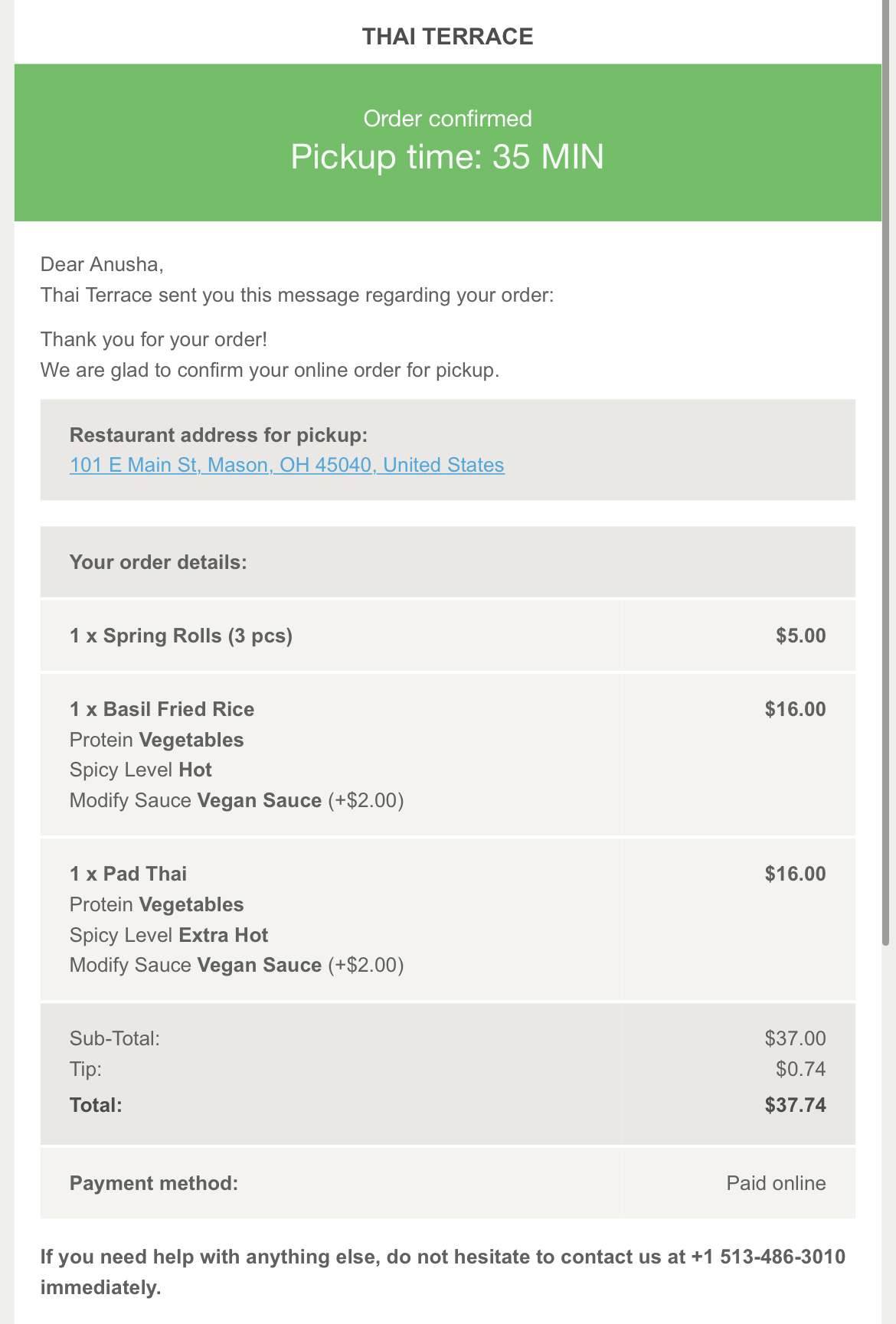 I made an online order. I asked for vegan sauce, vegetables as protein. I picked the order and came home I saw I had chicken in my Pad Thai…