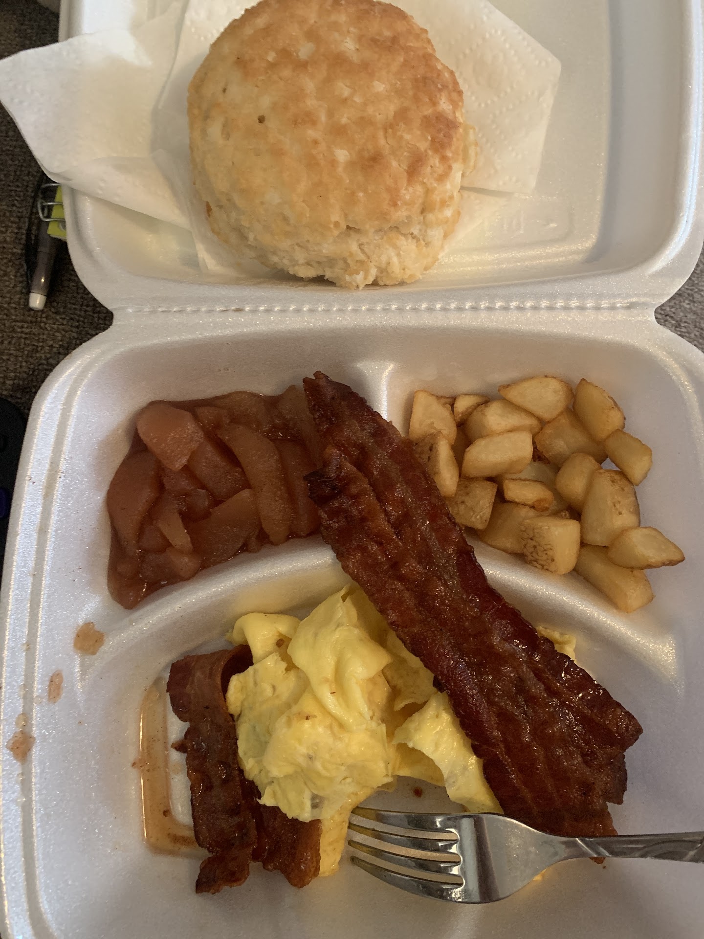 Read moreThis was one of the worst experienceâs Iâve had so far! Ask for toast instead of the biscuit twice, no way that is 2 scrambled eggs, and the apples leaked all over the eggs bacon and potatoes! I eat Tudors every morning for breakfast and have never had the apples put in the container with the other food! Now everything is apple flavored! Very disappointed! Needless to say they have Nothing on the Tudors in Nitro WV! Oh and this was the Super breakfast 2 eggs (fried or scrambled) 3-4 pieces of bacon ( or sausage) fried potatoes, gravy, apples, and a biscuit or toast! I paid almost $30 today to be disappointed. Serve others how you want to be served! Never serve ANYTHING you wouldnât eat yourself! I donât even want to...
