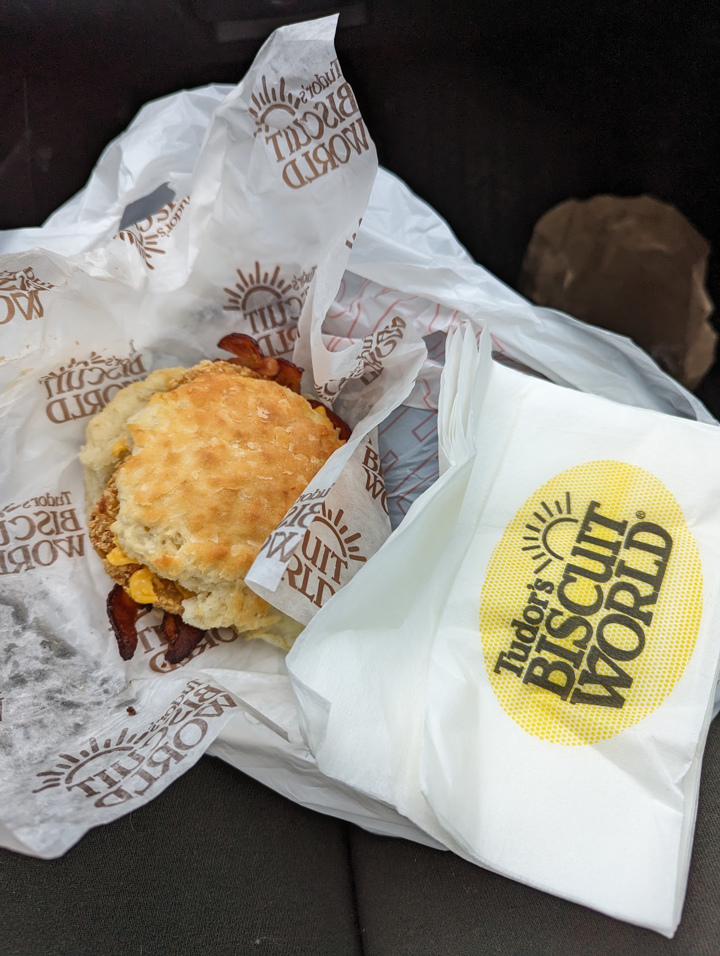 Read moreTudor's Biscuit World had real winners from this visit. First, this is fast food breakfast, so expect indulgent, fatty and salty with most products. I ordered the sausage gravy on a biscuit to try. As a sausage gravy connoisseur, this gravy was notably bland. The roux was nicely browned, but the seasoning was severely lacking. The notable winner, however, was The Duke, a bacon, egg, cheese and potato biscuit. The sandwich was huge, the egg was freshly cracked, the bacon was very crispy and the cheese was classic melty American cheese. The biscuit itself has a crisp, buttery exterior and a soft, fluffy interior. The potato didn't add much to the sandwich. My husband ordered the Fully Loaded Wrap and raved about it being the best fast food breakfast burrito he has ever had. It was substantially sized and the ingredients seemed pretty fresh as compared to other burritos from other restaurants. If you are visiting Tudor's, I suggest sticking to what they are known for, biscuit sandwiches. If you are feeling...