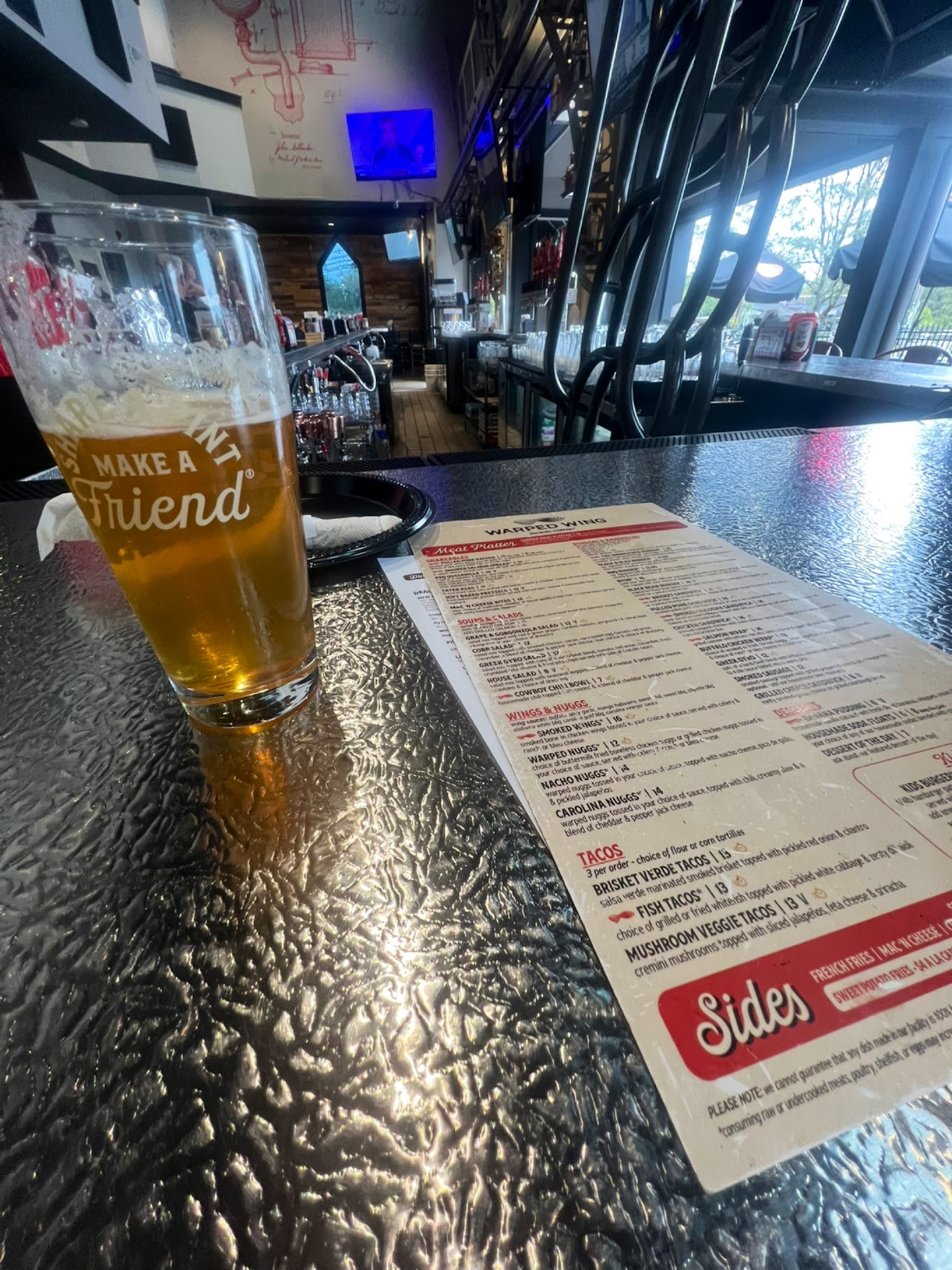 Decor & atmosphere completely disjointed. You're a Dayton brewery called Warped Wing, with aviation & Dayton neighborhood themed beers. Why don't you have aviation themed decor???? Completely missed the mark on that.