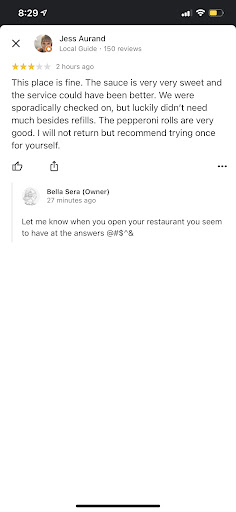 Normally I wouldn't post this but considering we have praised Sera Bella restaurant in the past I decided to share. I will NEVER eat there again. On Friday we're had a reservation at 3:00 to take two of my cousins and my Mom out to dinner. Some of us were still eating, others had ordered coffee and we all ordered dessert. The old lady, who I can only assume was an owner, came over to our table and said since MOST of you are finished eating, we need you to pay your check and go ahead and leave because we need the table. What?! Excuse me?! Let me clarify, we had not just been hanging out, we had just finished our salads and got our main course. Some of us were full and saved room for dessert which is why we were finished and others were not. The desserts were hurriedly brought from multiple waitresses while this lady kept telling them to hurry up so we could pay our bill and leave so they could get the table. We hurriedly ate our desserts and left while coffee was left unfinished on the table. There were lots of empty tables, no line or even people waiting and when we stepped outside there was nobody so I have no idea why she had a problem. We knew it wasn't our waitresses fault but what if we decided her tip was based on our entire experience? We didn't and we tipped her well but others may not.