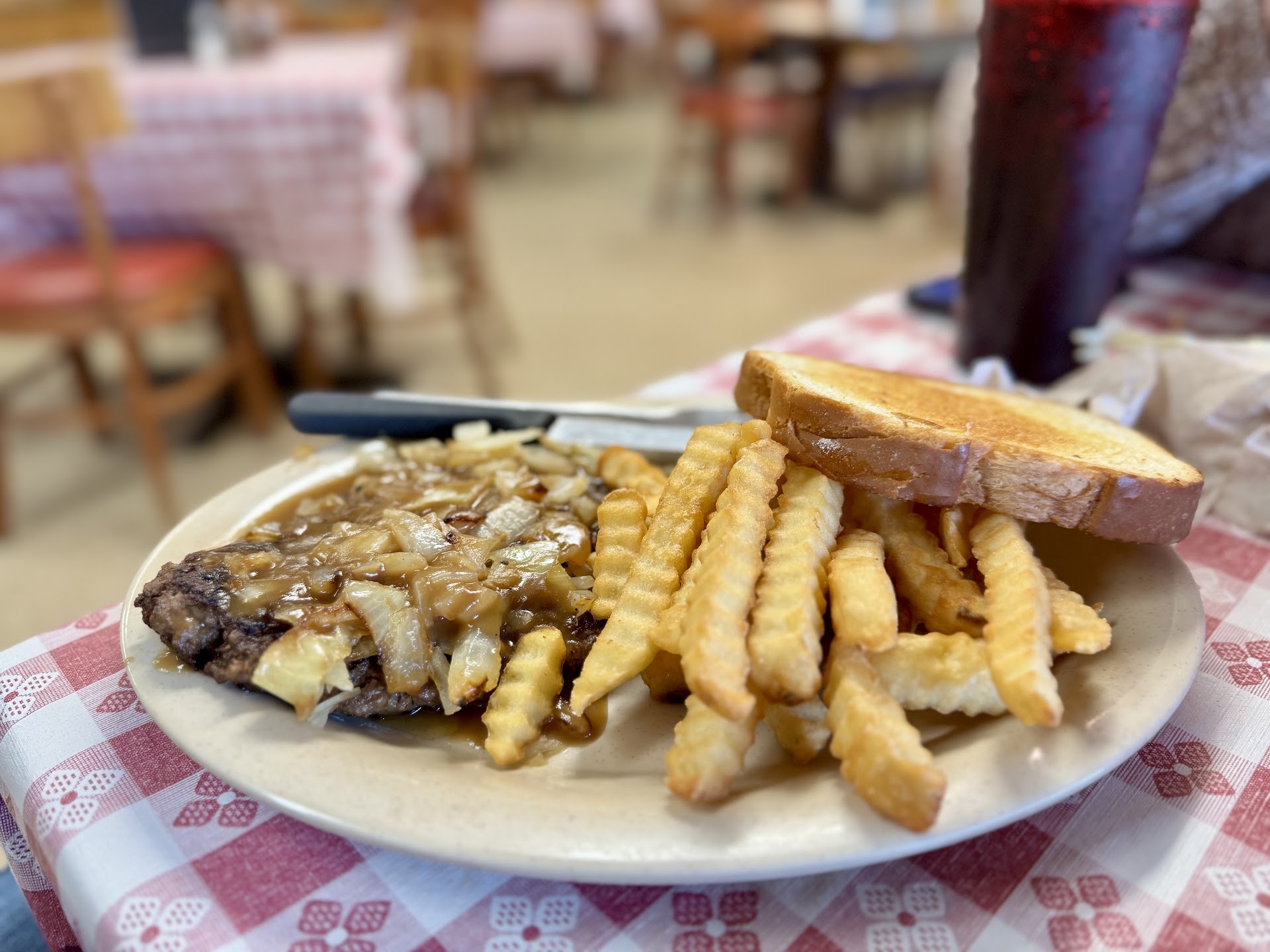 Sat down. Waitress took drink order. We needed a minute to look at menu. She said she'd be back in minute. 30 minutes later my husband had to go try to get someone to take order. The guy that came to take our order was nice. We had gotten steaks. I wanted well done, it was definitely well done. My husband wanted RARE. It came out at well. Poor cut of meat, to be honest. A different waitress came with the guy that took our order to bring the steaks out. She said i didn't bring silverware since y'all had salads. She left to get butter for my husband when I looked at plate and noticed there was no knife. When she came back, I asked her for a knife. She said that's why I said I didn't bring any because y'all had salad bar and they're up there but I'll go get it. She comes back with them, says nothing. I say thank you and get the knives. She says nothing and turns and walks off. By this point, I'm just wanting to leave, but we stay and eat. After that, we aren't checked on the ENTIRE time we sit there and eat. We were there a while eating, and the only person that ever came by was the tea refiller guy twice.