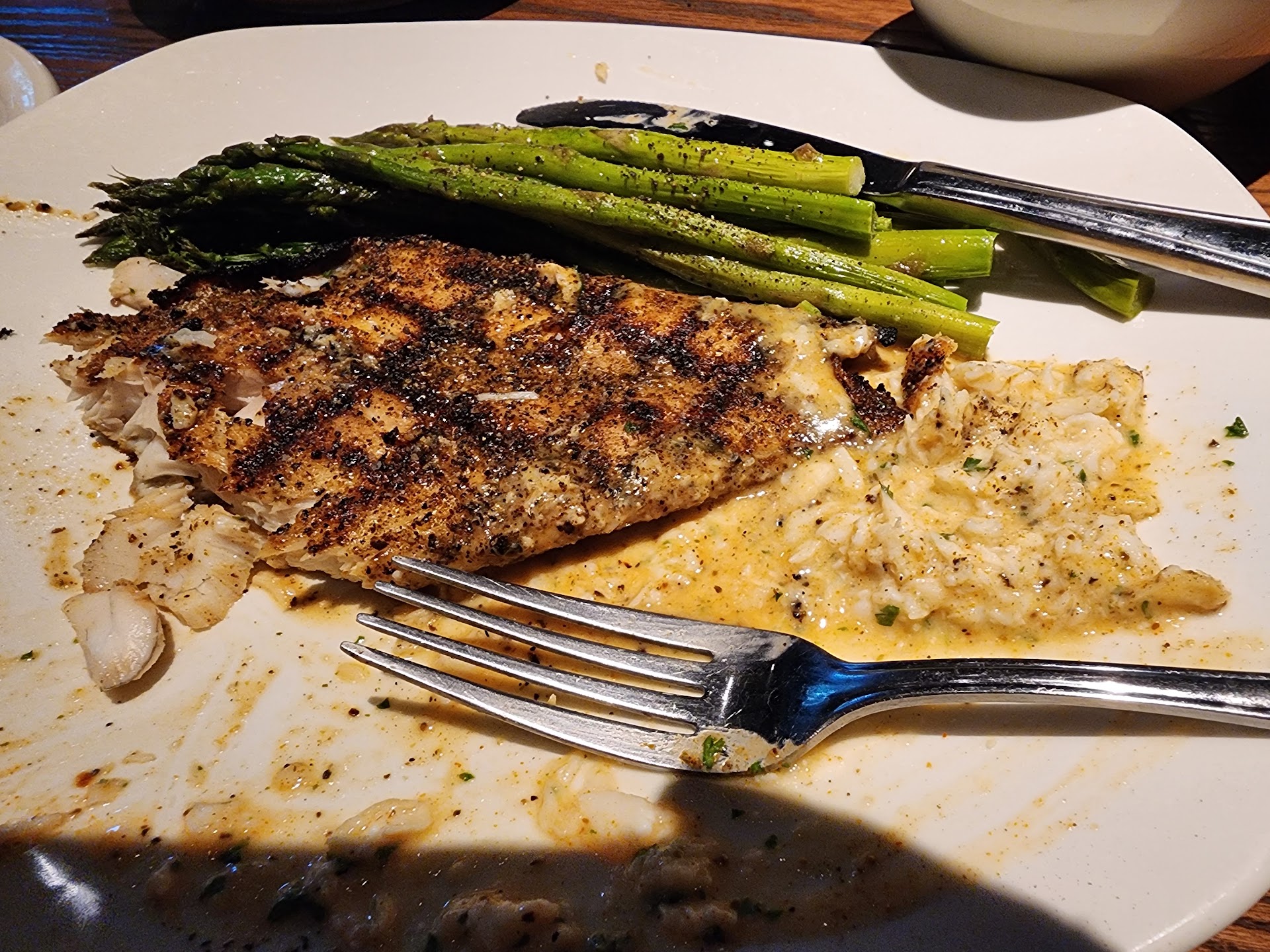 The food was top notch. We had an appetizer of Calamari, which was cooked well, was not rubbery, but the breading was crispy. I ordered the Filet Mignon with Lobster tail, with a side of asparagus, and garlic mashed potatoes. My wife order the Cod Imperial. My filet was cooked to a near perfect medium, and the lobster tail kept a smooth texture that was pleasing as well. The garlic in the potatoes was not overpowering to me, but was definitely a prominent flavor. The asparagus seemed to be cooked at the peak of its ripeness. It was hot, but remained crisp without the stringiness often found in undercooked asparagus. My wide enjoyed her Cod Imperial, but did mention the sauce was almost too strong for the dish. It had an almost bitter first taste that would fade into a wine butter taste after a moment.