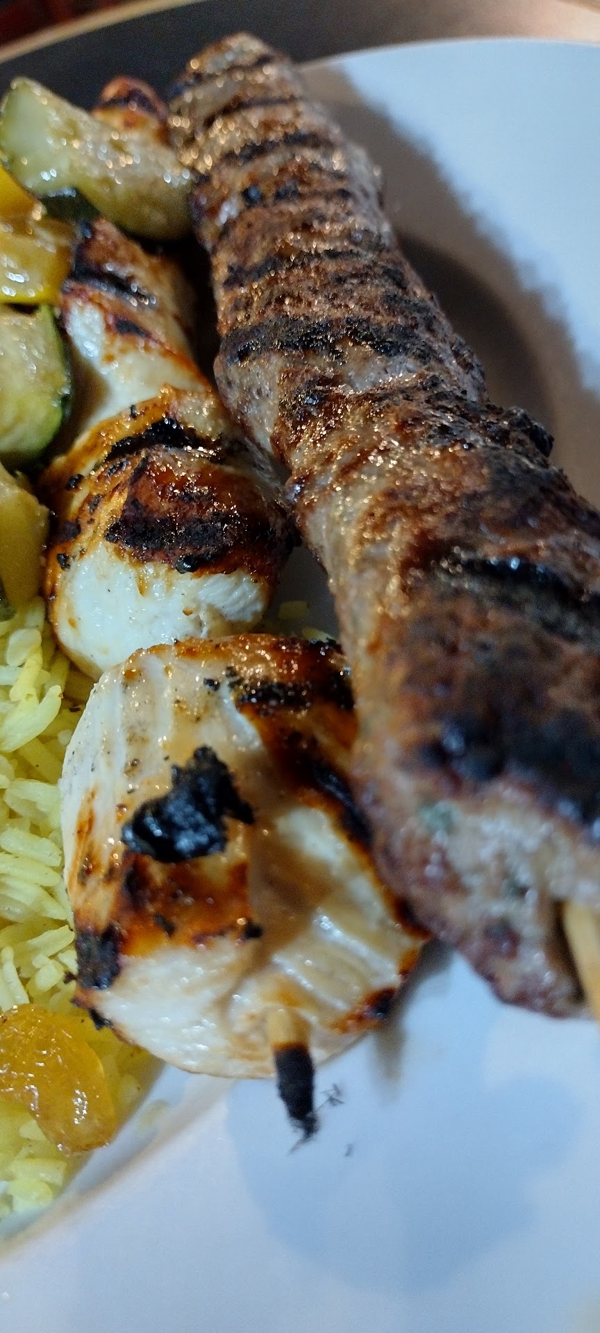 Read moreWe don't usually eat outside of our normal comfort zone and stopped here instead of Qudobo since it's usually very crowded but not as full on the patio that night so by chance we decided to give it a try and were extremely glad that we did. The roasted potatoes were amazingly delicious, the bread was warm and delicious. I had the seafood sampler with just shrimp and scallops - preferred the shrimp, the husband had the meat trio - the garlic butter for the chicken was so delicious and the ground meat kabab was my favorite, he preferred the lamb and chicken - the vegetables were so fresh and delicious as was the saffron rice - I loved the taste that the raisins gave the rice but the husband said he'd have preferred not to have the raisins - we will definitely be coming back - I want to try the cauliflower and chicken wings too. We had so much food leftover we took a good sample of the shrimp and ground meat and veggies and rice hime - my husband made me stop for a burger for our 19 year old son who's normally a picky eater but he didn't touch the hamburger he loved all of the food and wanted to know why we didn't bring him chicken wings. Again amazing food - if any restaurant should be a franchise available everywhere this one should definitely be in...