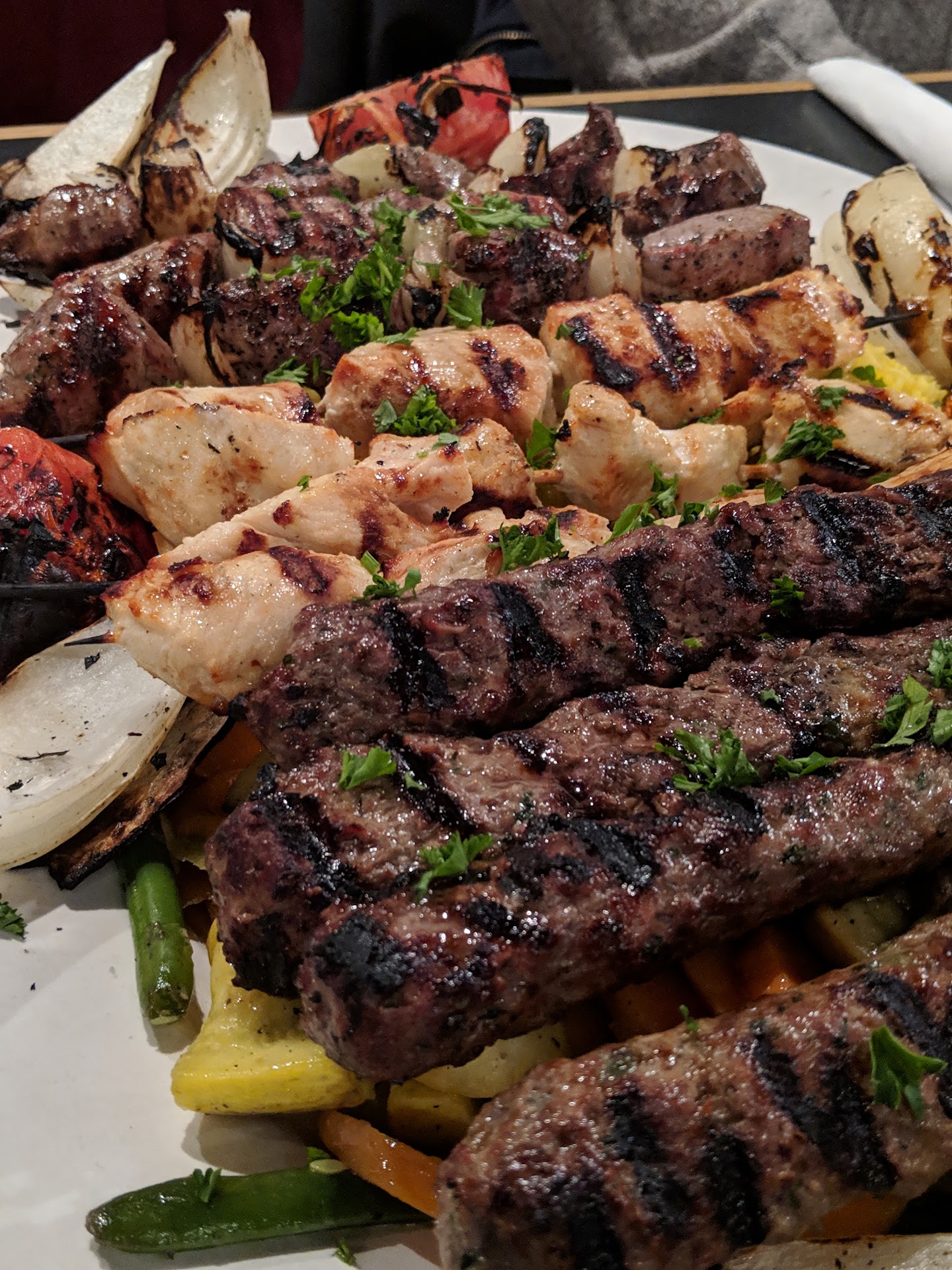 Read moreWe don't usually eat outside of our normal comfort zone and stopped here instead of Qudobo since it's usually very crowded but not as full on the patio that night so by chance we decided to give it a try and were extremely glad that we did. The roasted potatoes were amazingly delicious, the bread was warm and delicious. I had the seafood sampler with just shrimp and scallops - preferred the shrimp, the husband had the meat trio - the garlic butter for the chicken was so delicious and the ground meat kabab was my favorite, he preferred the lamb and chicken - the vegetables were so fresh and delicious as was the saffron rice - I loved the taste that the raisins gave the rice but the husband said he'd have preferred not to have the raisins - we will definitely be coming back - I want to try the cauliflower and chicken wings too. We had so much food leftover we took a good sample of the shrimp and ground meat and veggies and rice hime - my husband made me stop for a burger for our 19 year old son who's normally a picky eater but he didn't touch the hamburger he loved all of the food and wanted to know why we didn't bring him chicken wings. Again amazing food - if any restaurant should be a franchise available everywhere this one should definitely be in...