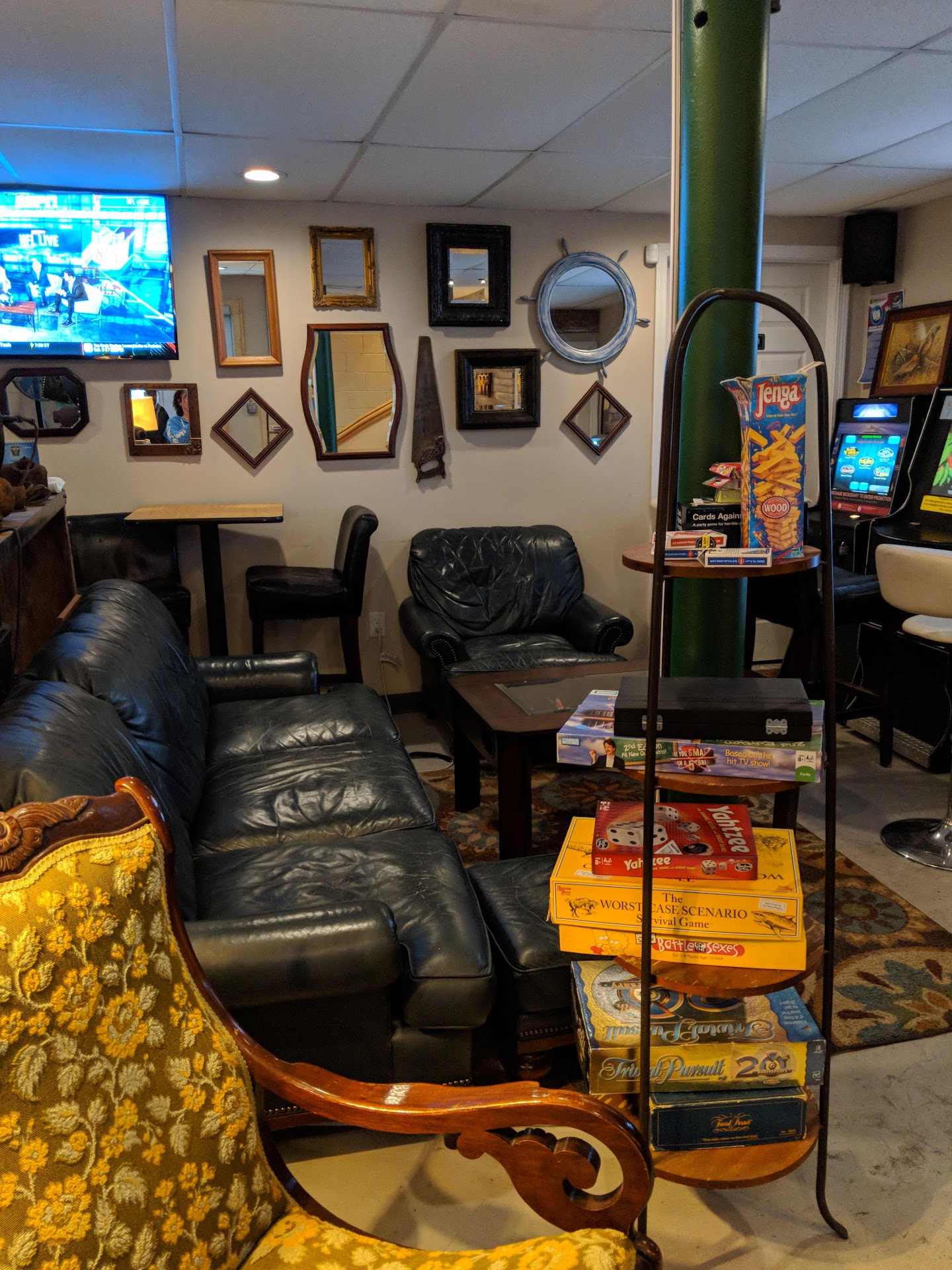 Lots of monitors to watch TV / sports. The restaurant is 2 levels with an outside area in the back. Downstairs are some video games, board games, couches and recliners. Outside has some seating and a couple outdoor games.