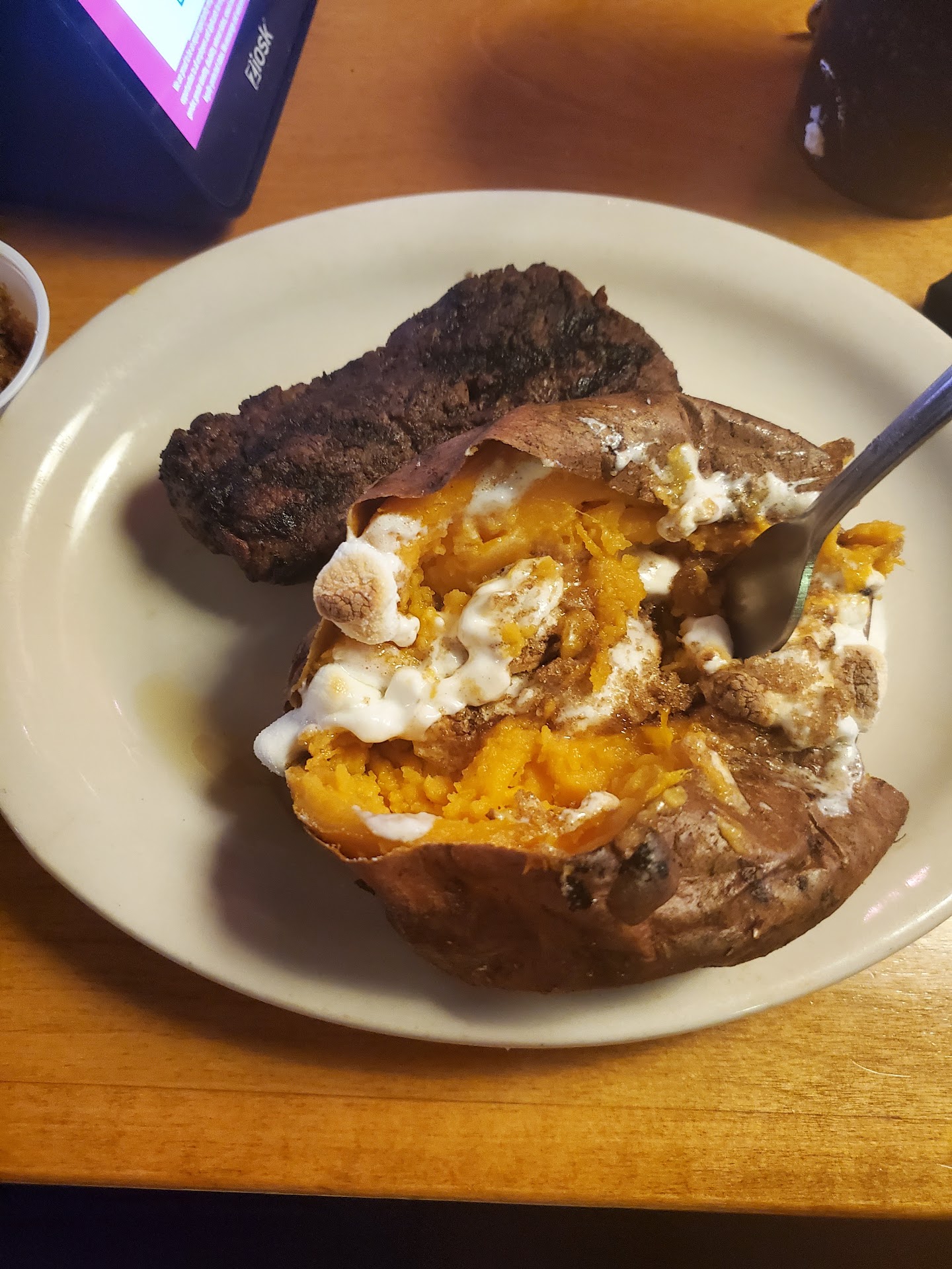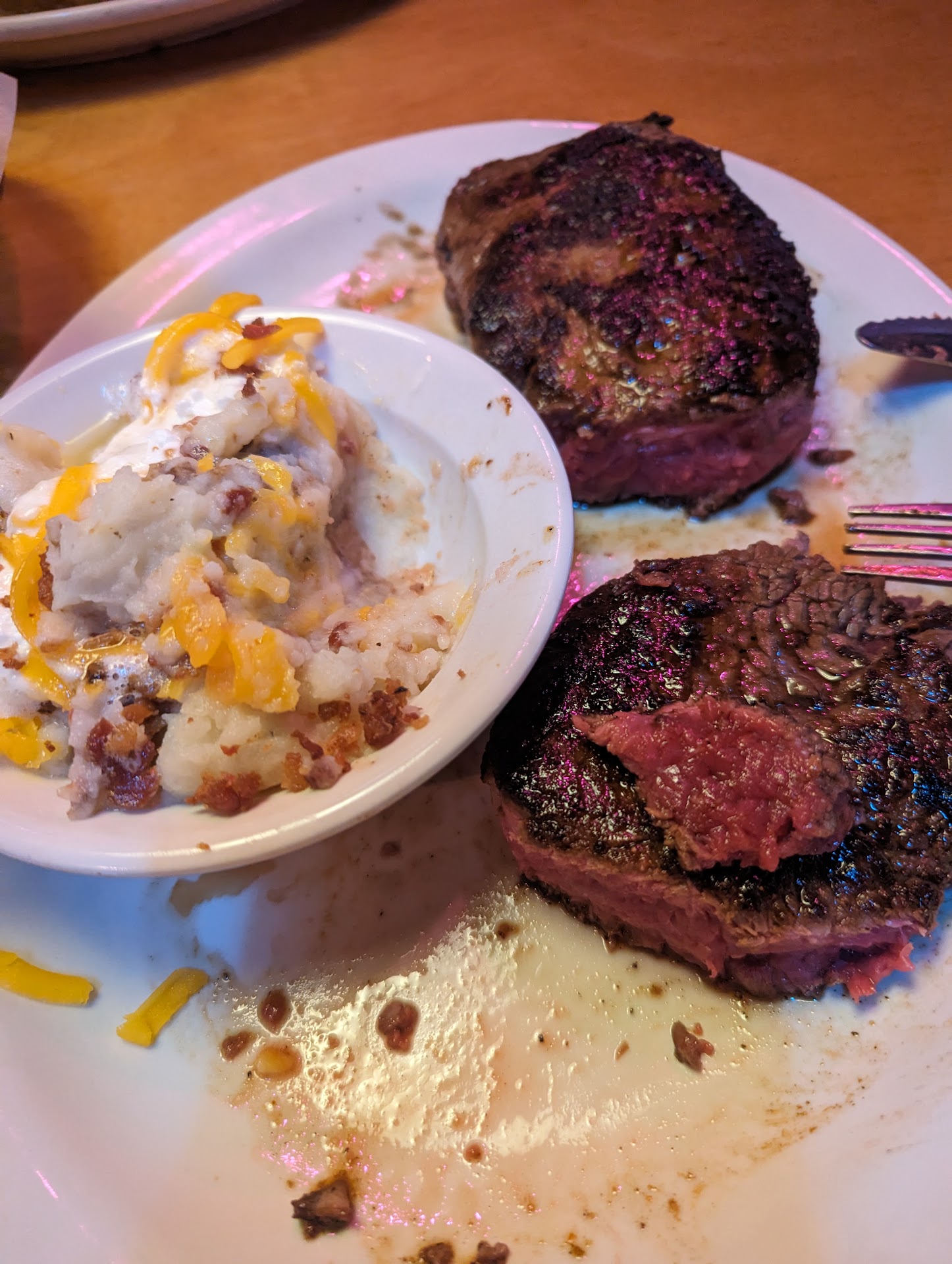 This last time we were there, we were sat down, no bread brought to the table, waited 20 minutes with no service. The silverware on the table was absolutely disgusting with crusted up old food on it so it needed replacing. A waiter finally realized we were sitting there after me having to flag him down to ask if there was anyone servicing our table or did we need to move. He took our drink order, then drinks never came. We got up to go to the front to find a manager already extremely frustrated. He promised he would seat us somewhere else and make it a good experience. We were honestly ready to just leave and go across the street to eat at another restaurant, but we decided to sit down and give it a chance. Our food came out a few minutes after being seated, salads came out following the dinners (at this point, why do you even want a side salad if you have your dinner?). Waitress was great at first, then disappeared. She finally came back and refilled out waters, then brought more bread as well as the side of butter we asked for 10 minutes prior for the potatoes.