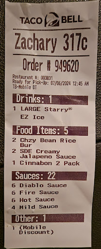 Usually pretty fast, accurate. Kinda skimpy on portions, I used to be an RGM for TBell out of state, I actually weighed my food on my kitchen scale, it was light and from the appearance it was the meat they skimped on. I got a total of FOUR. YES, FOUR pieces of grilled chicken in my full sized casadilla. Cheese was lacking as well and unevenly distributed. The four pieces of chicken were only on one of the four slices it's cut into. The drive through girl killed it though, hit every mark, even told me my 7 items were in the bag. Correct utensils, sauce, asked if everything on the menu looked correct. Was pleasant, looked clean and food safe. If I was the RGM and I was asking the crew to skimp out on meat, or any other item for that matter, I'd quit asap. It's bad business and you're gonna lose out regardless. Just ring in 10 beefy fritz burritos and ten of the chicken wraps that replaced the shredded chicken mini casadilla, then manager meal them out. And cut $1 of the amount that the employees could use for their free meal daily. At my TBell we were instructed to give employees whatever food they wanted AS LONG AS IT WAS RANG IN AND MADE BY ANOTHER EMPLOYEE. Saved from theft and variances. My bonus...