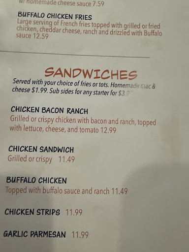 Read moreGreat bar and pool hall, however daytime wait staff was clueless. I ordered fried bacon chicken ranch with lettuce, bacon, tomato, and ranch, sub fries for side salad blue cheese dressing. My salad came out fine, but sandwich came plain w fried chicken and bacon, no thing else. I asked server for sides of sandwich and he thought I wanted it in a salad so he brought me another plain...