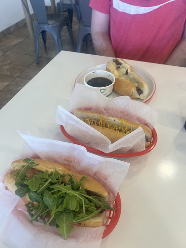 Food: The menu of hot sandwiches and paninis all sounded so good I was hard pressed to make a decision. I landed on ordering the Belly Dancer without cheese and a hot dog with sauerkraut and mustard. My partner ordered the Shiitake Mushroom Melt, which comes with a side of au jus.