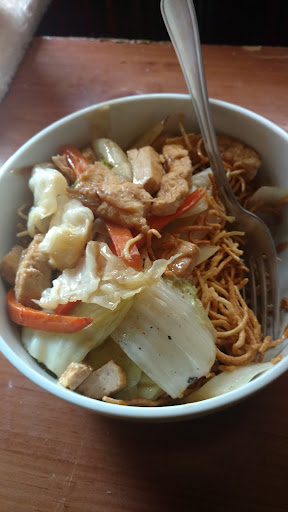 Crispy Fried Egg Noodles Another fave dish. Deep fried egg noodles with a pourable brown gravy consisting of shrimp, calamari, onions, won bok, carrots, and chicken. It's a huge portion. Goes great with a side of Jasmine rice.