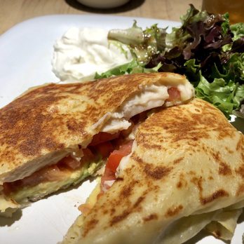 Chicken Avocado Crepe I loved it! The crepe was perfectly cooked and filled with fresh avocado, moist chicken and other subtle seasonings with sour cream to the side. The small side of green leaf salad (my favorite veggie) went well with the crepe. It's also an ideal portion size.