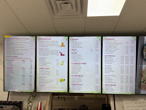 MENU: Breakfast, Hawaiâi-style plate lunches, handful of Chinese dishes, burgers, catering menu.