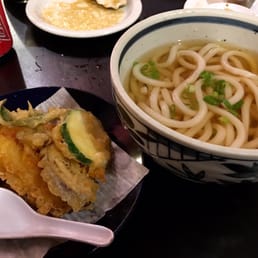 Tempura Udon Got udon? I will try it! From the pictures, it didn't look like the broth had much flavor to it being so transparent, but the reviews were mostly positive, so what they hey... I'll form my own opinion! I asked for the tempura to be separated because all the pics show them served in the broth getting soggy, but apparently they're now served separate, so no need to ask. The broth had a deliciously subtle bonito flavor, yet not fishy at all. The udon were cooked perfectly chewy. The chopped green onions gave the broth added depth. The tempura were all freshly battered, nothing frozen, and included 2 shrimp, some fresh green beans, a slice of pumpkin, and eggplant which I do not eat. My only gripe is that there was no dipping sauce for the tempura. I could've asked for some now that I think about it, but I used the udon broth instead. Fair portion size for the price.