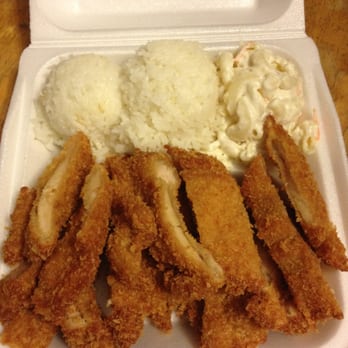 FOOD: Chicken Katsu Huge portion! It's about 3 or 4 fillets, 2 scoops of rice and mac salad. The batter is tasty and not oily, and the mac salad is pretty good but not the best I've had. The katsu sauce is too sweet for me. I use a store-bought sauce at home which is darker and saltier.