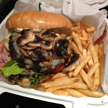 FOOD: Mushroom Burger Wow. THE BEST mushroom burger I've eaten so far, but unfortunately no longer sold. The burger was thick, hot, very tasty and juicy and had that hard to find broiled flavor. It's topped with Swiss, tomatoes, lettuce, red onions, lots of sliced pickles and mushrooms. I loved the bun! It was hinged on one side which helped the burger stay in perfect shape while eating it. Fries are optional shoestring and were delicious and full of flavor.
