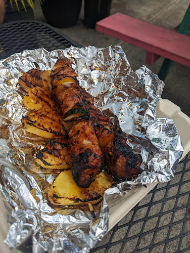 This is a mix of poke bowl or burrito option and then grilled options (kebobs and sides). They have chicken, steak, shrimp AND a veggie option. The kebob plate is generous in size with rice, salad and two kebobs. The grilled pineapple (on kebob or as a side, you'll probably want extra) is delicious.