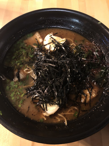 Ramen The broth was a very subtle tonkotsu base and tan in color (thankfully NOT white like milk which is so unappetizing to me). Sparse drops of black garlic oil gave the slightly creamy broth smoky and garlicky notes here and there but not throughout the dish. The lack of sodium and depth was disheartening, but most disappointing was that it wasn't searing hot which always kills it for me. I'm still on the fence about the noodles which I feel are too thin for ramen. They had an odd texture like buckwheat and felt a bit slimy on the palate. I prefer an eggy, chewy, thicker noodle. Toppings were paper thin slices of chewy pork belly, nori shavings, fresh seaweed, green onions and a whole gooey egg cut in half. Sorry, pass for me.