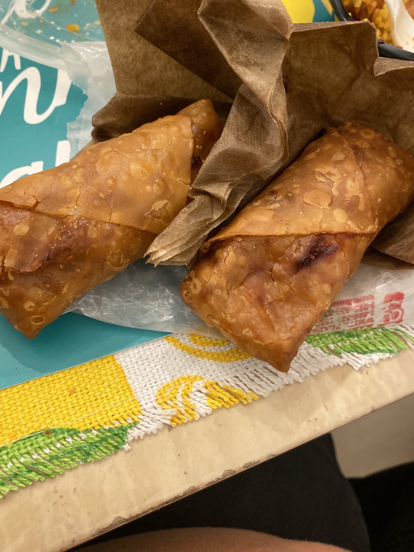 The spring roll was almost entirely the crispy exterior with very little inside and what was inside was mushy. The egg roll was pre-cooked and just reheated. More filling but disappointing nonetheless.