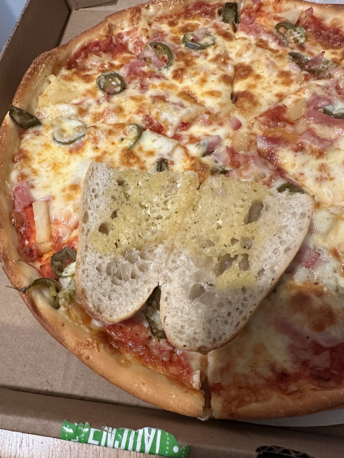 $5.50 for two slices btw. Two slices that don't include cheese. I didn't expect it to include cheese, but for the cost vs the amount you get it ought to. And to further demonstrate a lack of care for their food (and customers), the garlic bread came placed on the pizza. In the box.