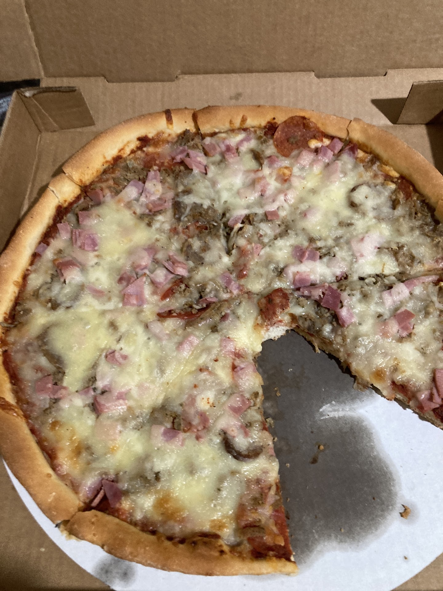 The bad: I've tasted more flavorful sauce of out a jar labeled Ragu. I'm fairly convinced this is where Hollywood gets all their pizzas for shooting, because these slices stuck out like they've been worshipping at the throne of Viagra. I wasn't aware that imitation mozzarella was a thing, apparently it is. The pineapple lacked flavor and had an odd texture. Like it's two days away from being bad.