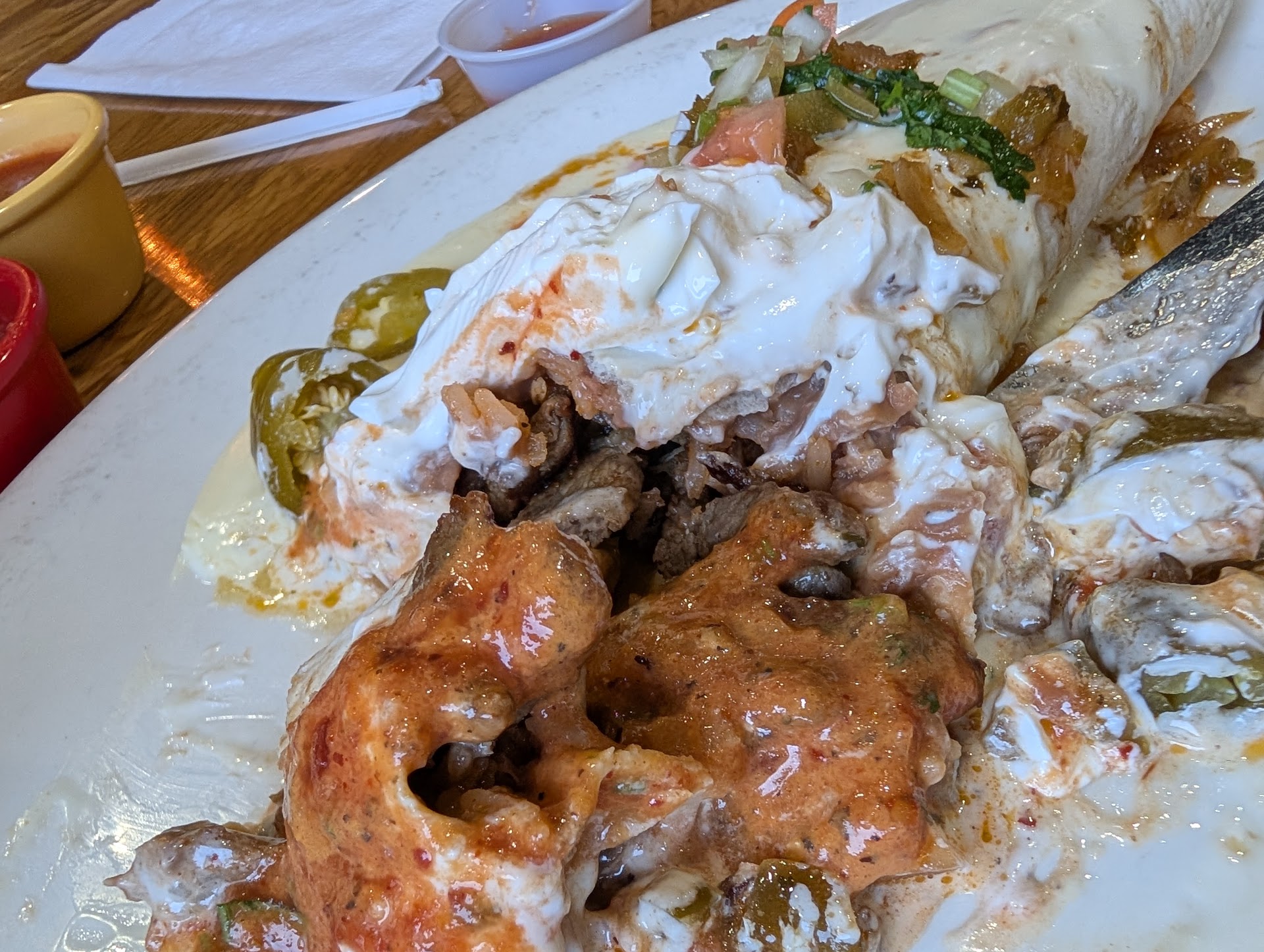 Overall, it was a great experience. When we entered, we were greeted immediately. We came out of not so busy time, so we were seated quickly. Our server took some time to come back to our table to get our food order, but that was really the only downside of the service. Everyone was attentivethe rest of the time. The salsa bar is nice, and there's a good variety of different spicy sauces to try. I really enjoyed my Tamal that I had. it was chicken. The chicken was a little dry, and you could tell it was a frozen Tamal at one point. Was not spicy at all. This was disappointing to me because I like it spicy but is a nice feature to have for people who aren't a big fan of spicy foods. The spicy salsa was delicious. I put that over the Tamal to make it spicy. My enchiladas were really good! the sauce, the seasonings, and the rice were excellent. The chicken inside could have been seasoned more. Tasted somewhat Bland, but I understand that Americanized Mexican food is to appeal to a large demographic of people. So, I just added more salsa to add more flavor to my enchiladas. My husband got the birria tacos, which were fantastic. The consume was flavorful and added so much depth to his food. I would definitely recommend this place for people who love texmex / American style Mexican food. There was a small amount of parking at the small parking lot. My husband and I try not to go to restaurants during busy hours. So we found parking easily. The menu does include vegetarian options in a vegetarian section of the menu. All the menu items are clearly labeled, and descriptions are detailed. I definitely will come back to eat again...