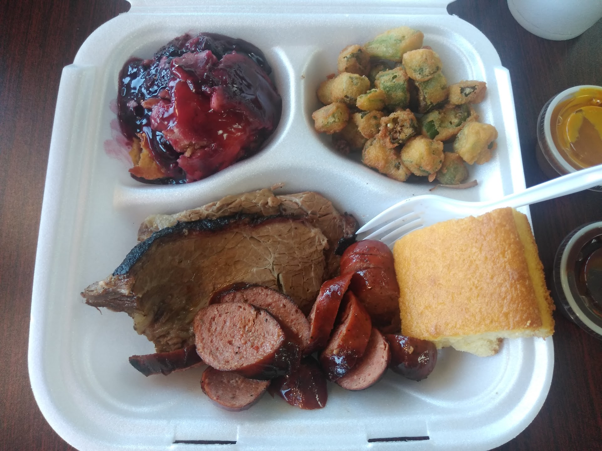 Wholy Disappointed. It says "Texas Style BBQ" on the outside, but don't be fooled. It was far from it on my visit. I grew up in Texas for the first 30 years of my life on good Texas BBQ, I should know when its the good stuff. I ordered the $18 2-meat plate with brisket and beef sausage, and I originally ordered spicy pintos and fried okra for my sides, but was informed they don't have the spicy pintos today even though they were on their hand-written blackboard of available sides, so I opted for blackberry cobbler instead.