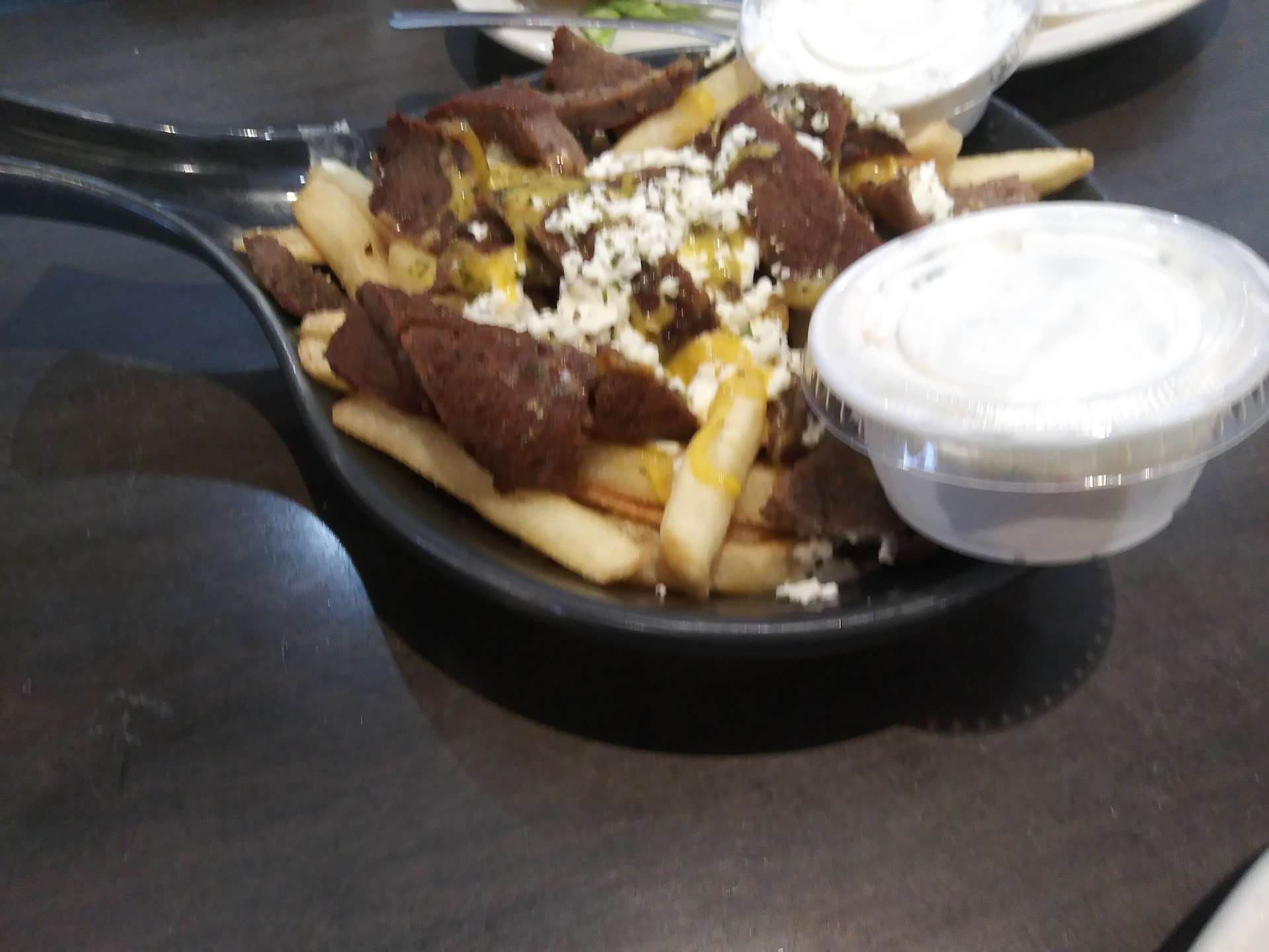 Read moreSlow service, the waitresses seemed preoccupied. The mushroom swiss burger I ordered did not even taste like it had been seasoned in any way. Just burger that they grilled up with no flavor. The cheese and the mushrooms were OK but I had to salt the thing before I could even eat it. The "greek" fries I ordered were so burnt/crunchy that I couldn't even really eat them. It's like they doused them in feta and oregano hoping I wouldn't notice the crappy fries. They were WAY overcooked. I asked for onion on my burger and I did not get it. The gyro my husband ordered was falling apart, the pita type bread they wrap it in is so dang thin, it rips just picking it up. I've ordered one of those before, too. I've been here about 4-5 times now with coworkers, and most recently with my husband...and NONE of the tables are cleaned off for new customers to sit down. Every single time I come in, I have to wait for them to wipe down my table. Not kidding. This most recent time there were so many dirty tables, my husband had to wait almost 10 minutes for a booth that was clean! And they were not packed at all! Then the waitress forgot everything we asked her for and had to go back 10x. I probably won't pick this...