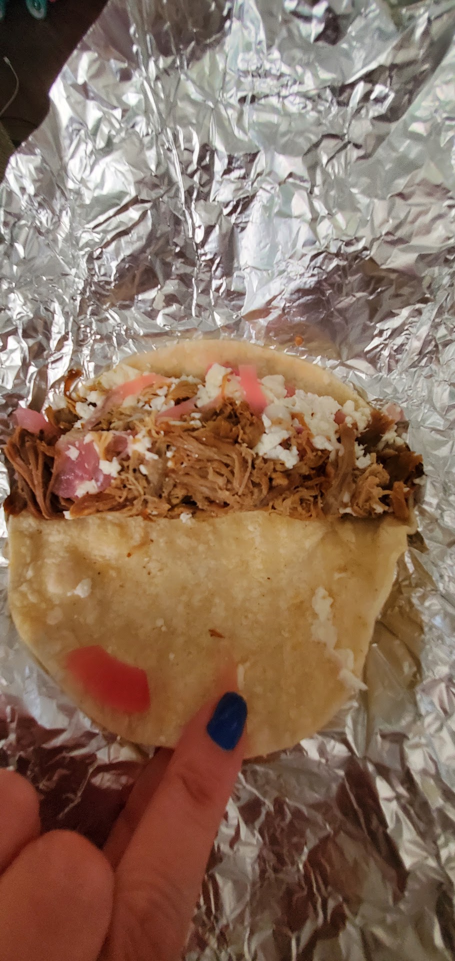 1 Fried Chicken Taco- I got 2 tiny chicken "chunks" in my tacos 1 Grilled Fish Taco- Decent amount of fish. I had HUGE pieces of red cabbage in my tacos. I love red cabbage but these chunks were the size of my thumb or bigger. 1 Grilled Shrimp Taco- it was okay. Sauce was good. Again, huge chunks of red cabbage. A queso & chips- that was OK but I was disappointed at the small portion of cheese for the price. I told the employee it was my first time there and he did mention that I get a choice of taco shell- corn or flour I think? But then I never specified as I was busy picking my tacos.. I forgot about it, so when I got back to work, I realized he chose corn for me. Wouldn't have been my choice, and they were not toasted or warm, they were just cold. I spent $11 and I just want my...