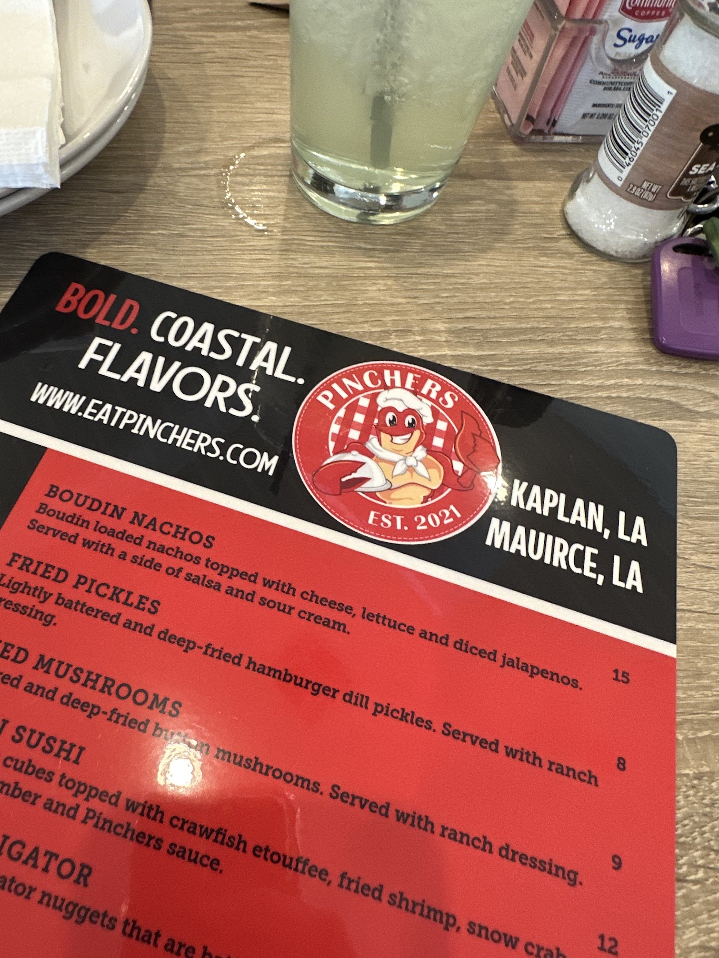 Read moreWe had a delightful experience here. We saw Pinchers when we were passing through Maurice. The reviews online convinced us to try it. We arrived around 5:45 pm on a Friday. There was plenty of parking, and we got a table for 3 immediately. The hostess was very nice, and our server Lanie (sp?) was incredible- so friendly and professional. Ask for her! The space itself is very appealing with large colorful art, a word mural, and giant chalkboards. I peeked at the bar area, and it is beautiful. Our food was delicious! We especially loved the crawfish wontons! The flavor in the "stuffing," the crunch of the wonton, and the sweetness of the Steen's syrup was some kind of magic. Our entrees came with a garden salad, and I am always so appreciative when salad is served on a cold plate, and it is here. All of our entrees were terrific, as well. I asked Lainie which was her favorite dessert, and she said the bread pudding, so we got that. Absolutely delicious! The creme anglais sauce was perfection. I'd choose to drive to Pinchers from Lafayette any day of the week! Truly a lovely experience...
