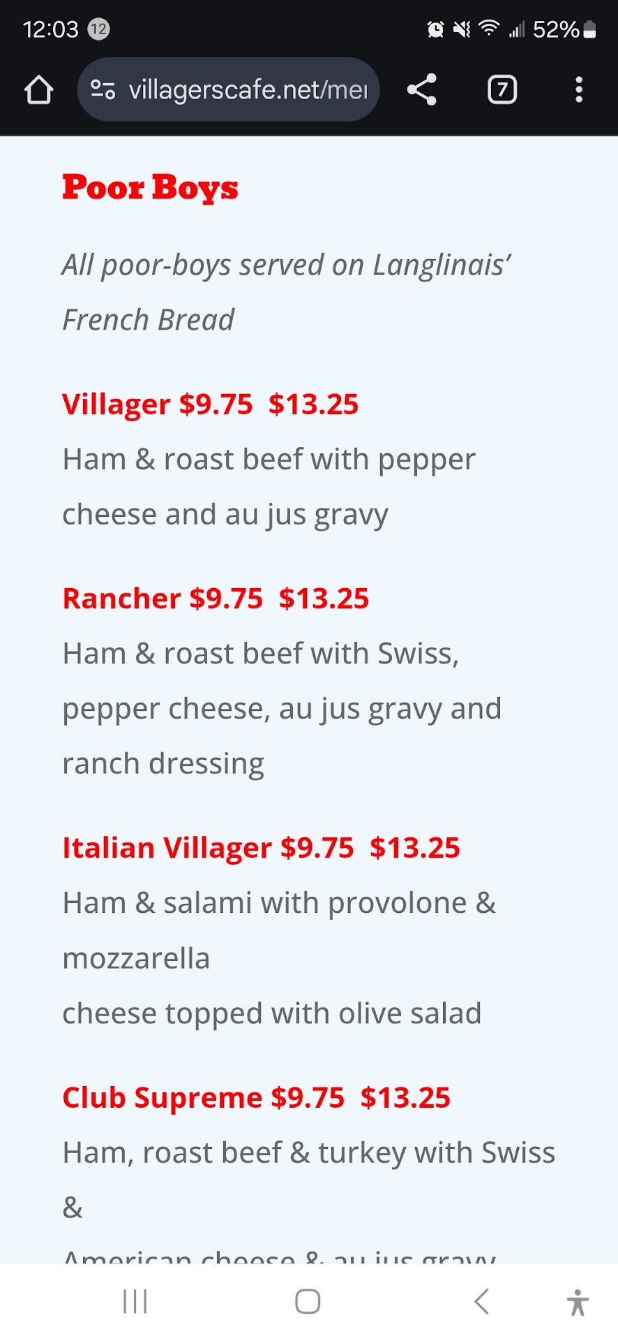 Read moreSo this was an interesting little place, and I mean little! Love the crazy decor. The menu was decent for a cafe but was surprised with all of the sandwiches there wasn’t a burger. I had the Villager poor boy. The bread was a good poor boy bread with thin sliced ham and beef with a little gravy and veggies. Some places have horrible bread. The fries were unique, never saw them cut that way but they were crispy and tasted great. It’s a busy in and out kinda place, I wouldn’t recommend sitting around after a meal chit chatting. Service was ok, the server was very nice but because of the size of the place she literally was handling every table herself. If you want a lot of attention from your server this isn’t the place for you. We had enough attention to get the job done but it was a little slow since it was packed and people waiting outside. Overall a good...
