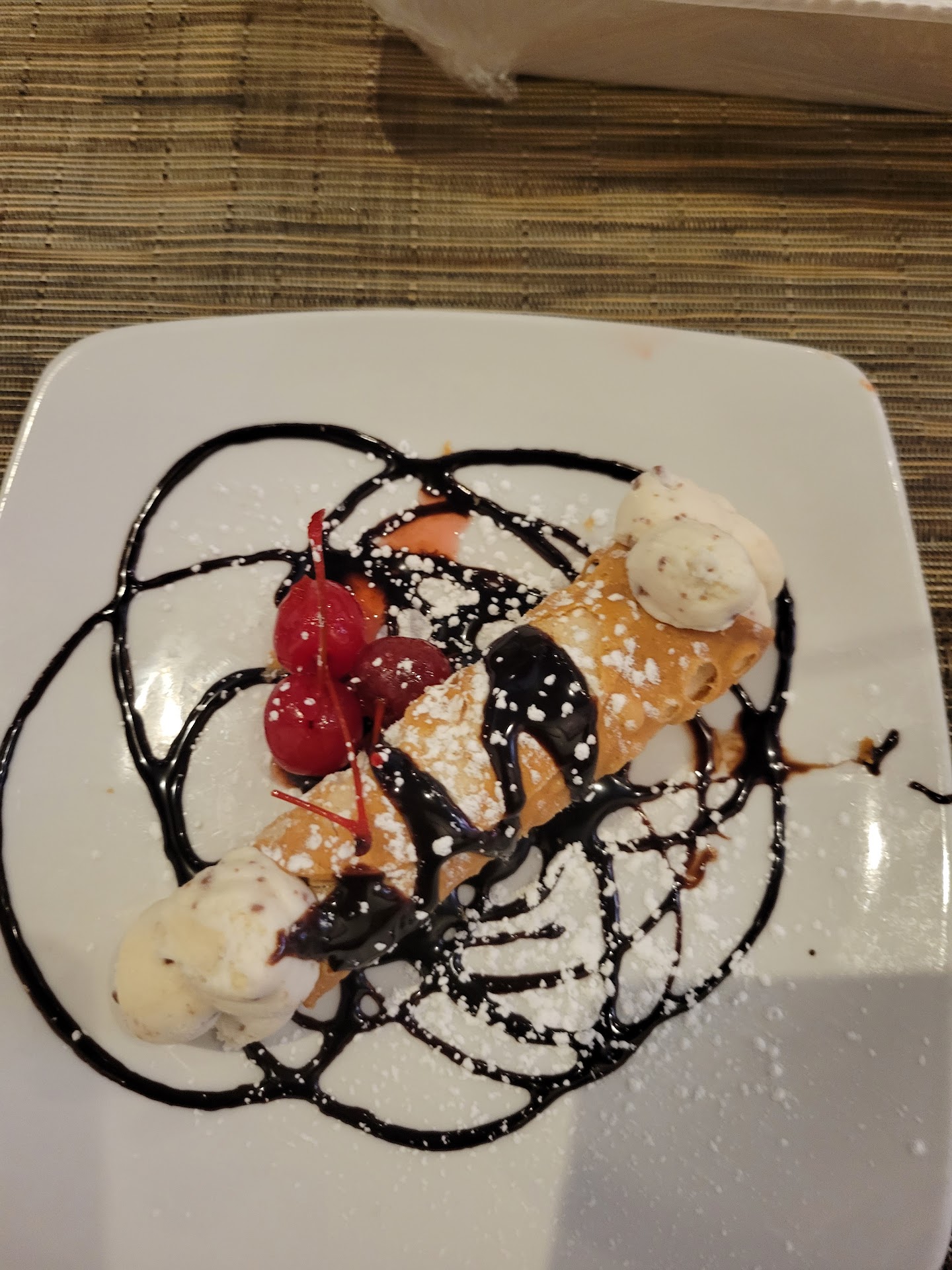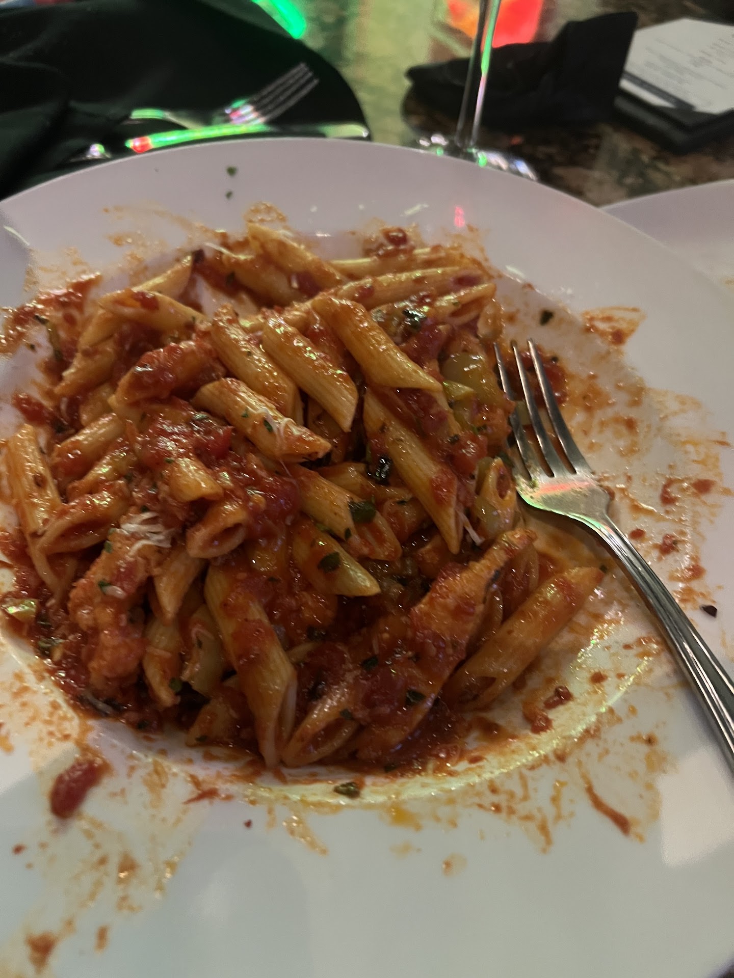 This is the last time I am eating here. This place misses the mark on taste and flavor. I have eaten here probably 4 times and no more. I ordered the special which was advertised as penne pasta in a ricotta cream sauce with chicken and red peppers. What arrived was in fact penne pasta, a weird-tasting cream sauce, red peppers, some unidentifiable pepper or mushroom (which I hate) and wait for it…..poached chicken. Who the hell poaches chicken in a pasta dish? Hello 1979 calling. It was white, opaque and not visually appealing. I pulled out all the chicken and lined them on my plate. Our server (who was terrific by the way) saw what I did and asked if I wanted grilled chicken instead. Yes please. Why don’t they offer this instead? I understand that, depending on how you season chicken, it can fight with the flavor of the pasta. But when done right, the dish can sing. Grilled chicken was delicious. The hubby ordered the double pork chop. He said it was very good. The dish was advertised as being served with a demi-glace. By looking at it on the plate and seeing the sauces transparent edges, it was a cheater Demi-glace. Now I understand not every restaurant will make a demi-glace from scratch because of how time-consuming it is (especially for an Italian place and not a meat-centric place) but that semi-glace looked like a package gravy mix. Caesar salad was good.