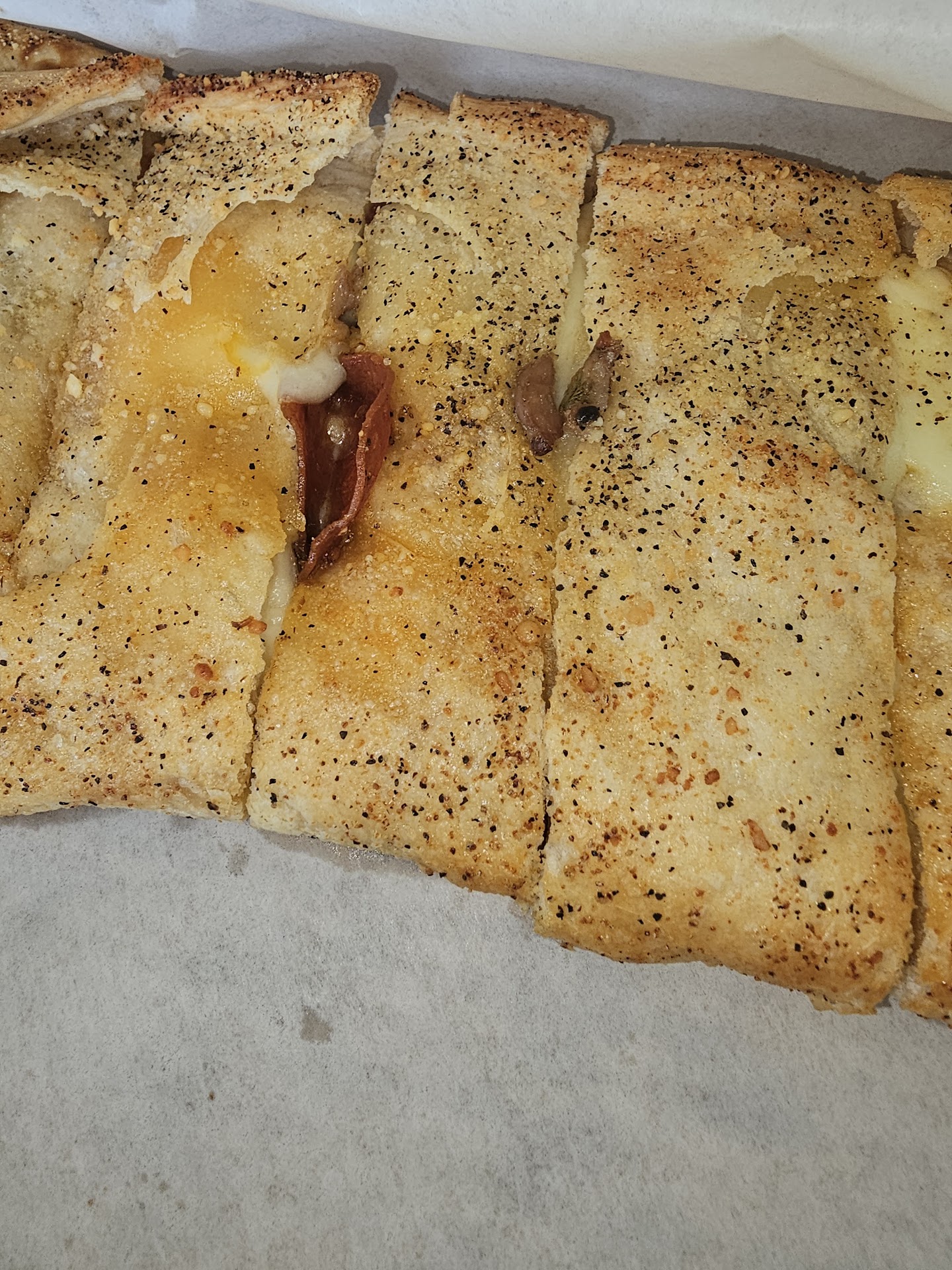 We also got these garlic bread triangles at $1 a piece. They are basically flatter Crazy Bread with a seasoning on top. Seriously I feel like they are an exact copy of the dough and baking temps used at Little Ceasers. It was a flash back to college days. They are also not baked fresh and this is overwhelmingly obvious. We ate them in the car on the drive home and they were room temperature at best.