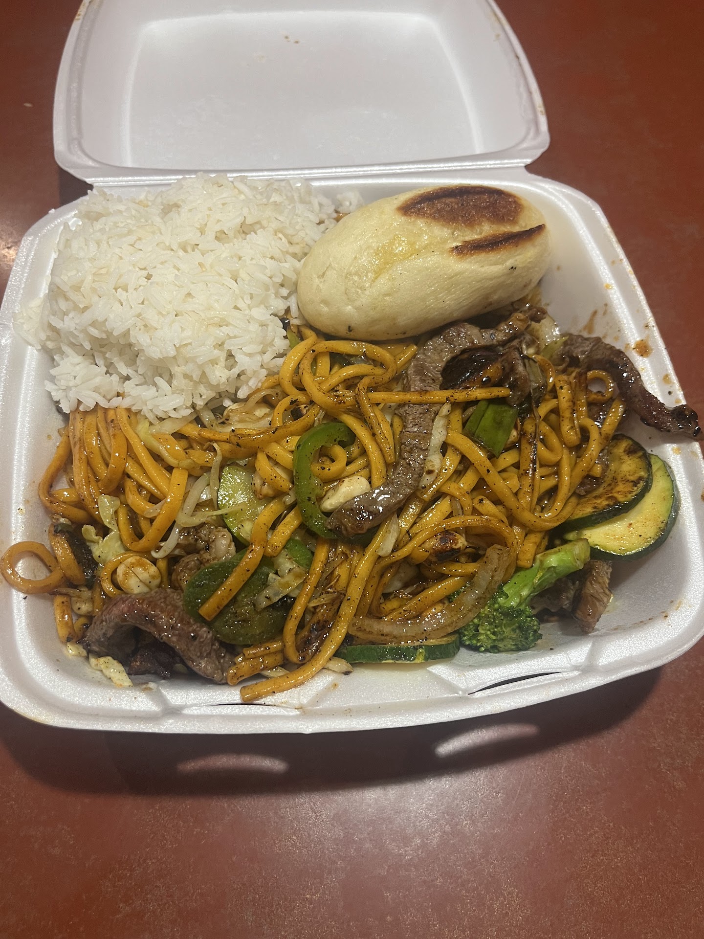 You walk in, a host greets you and explains that you will grab two bowls: a large bowl for your noodles and veggies, and a small bowl for your meats. You then go cafeteria style choosing your pasta, veggies, meats. All of these ingredients are raw. Then you go over to the spice bar, where you can season your bowls with all types of spices. After than you go over to the grill, in which your food will be cooked. You will choose what type of oil you want your food to be cooked in, along with the sauces you would like. The variety is amazing. You can add shrimp and egg too. Then you can order for there or to go; I always order to go because I never finish my plate (you will be seated either way so doesn’t matter). Then you will be given the choice of white or fried rice. Either is good.