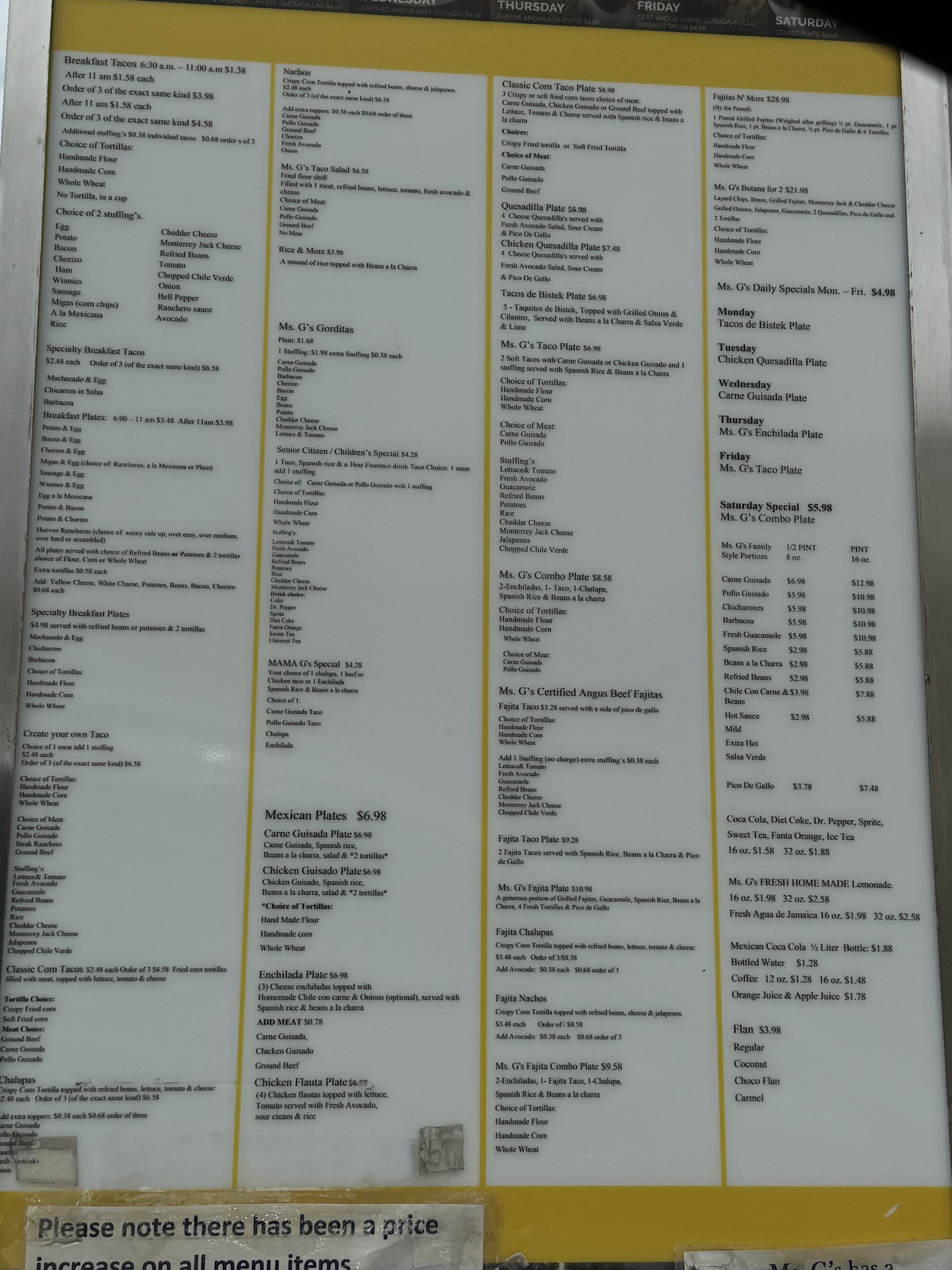 Read moreThe carne guisada is what brings me back to Ms. G's time and time again. I hope they never skim on their quality and portions. The food is pretty consistent but I'd like the meat to be trimmed a little better to cut off more of the gristle, fat and nerves but I'm super picky and like the meat to be extra lean. Most people probably aren't as picky as me. I have to pick through my tacos every time to remove what I don't like and leave only the meat. If you aren't as picky as me about the meat and you can eat anything then you'll absolutely love Ms. G's. I've noticed that some things aren't what they use to be for example, they don't run their agua fresca machine anymore The empty inoperable dispenser speaks negatively about the business like if they're not doing so well or that maybe they don't care. I would get that thing up and running ASAP because even if you don't sell much agua fresca, at least make it look like you do. I enjoy seeing Pina, Tamarindo and Jamaica aguas running and it makes me want some plus it lets the customer know that they care about the appearance of the place and that they're pushing all their products. Be proud of your mother's legacy Ms. G, keep up on the great food and consider some cosmetic improvements. The customers will keep coming trust me...