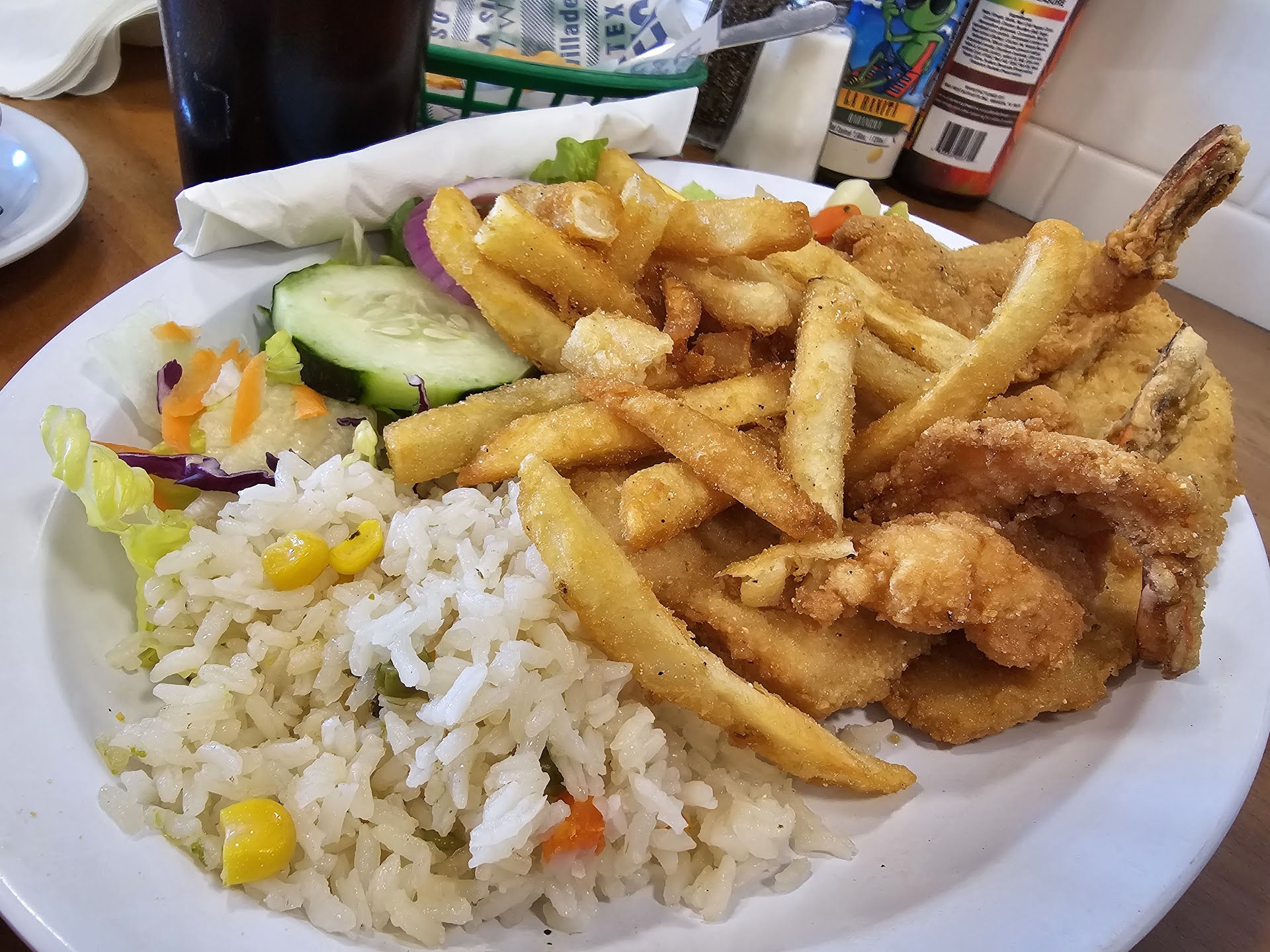 Let me start... U get a small dish of refried beans...with homemade corn fried chips... U also get an 8 oz bowl of seafood gumbo...on the house... These appetizers are at least 9.95$ in my eyes.. Then comes the great plate with shrimp and fish combo. It is made very well..taste is just right...what u see in plate is what u get... Then my cola of course... All this for only 23.95$