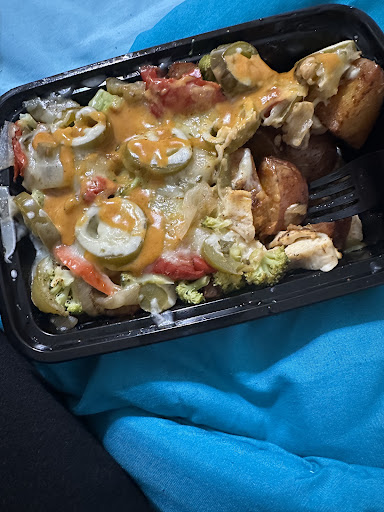 Cons:(personal) this time around I Already dug in before noticing that the chicken is premade . Doesnāt take too much away from taste but I donāt personally love it . I hate the texture or pre made chicken . Again , this is a personal preference! Thatās not to take away from the chicken being served hot . I ordered red skins , jalapeƱos, broccoli, chicken , roasted peppers and onions , pepper jack cheese and chipotle sauce on the side.