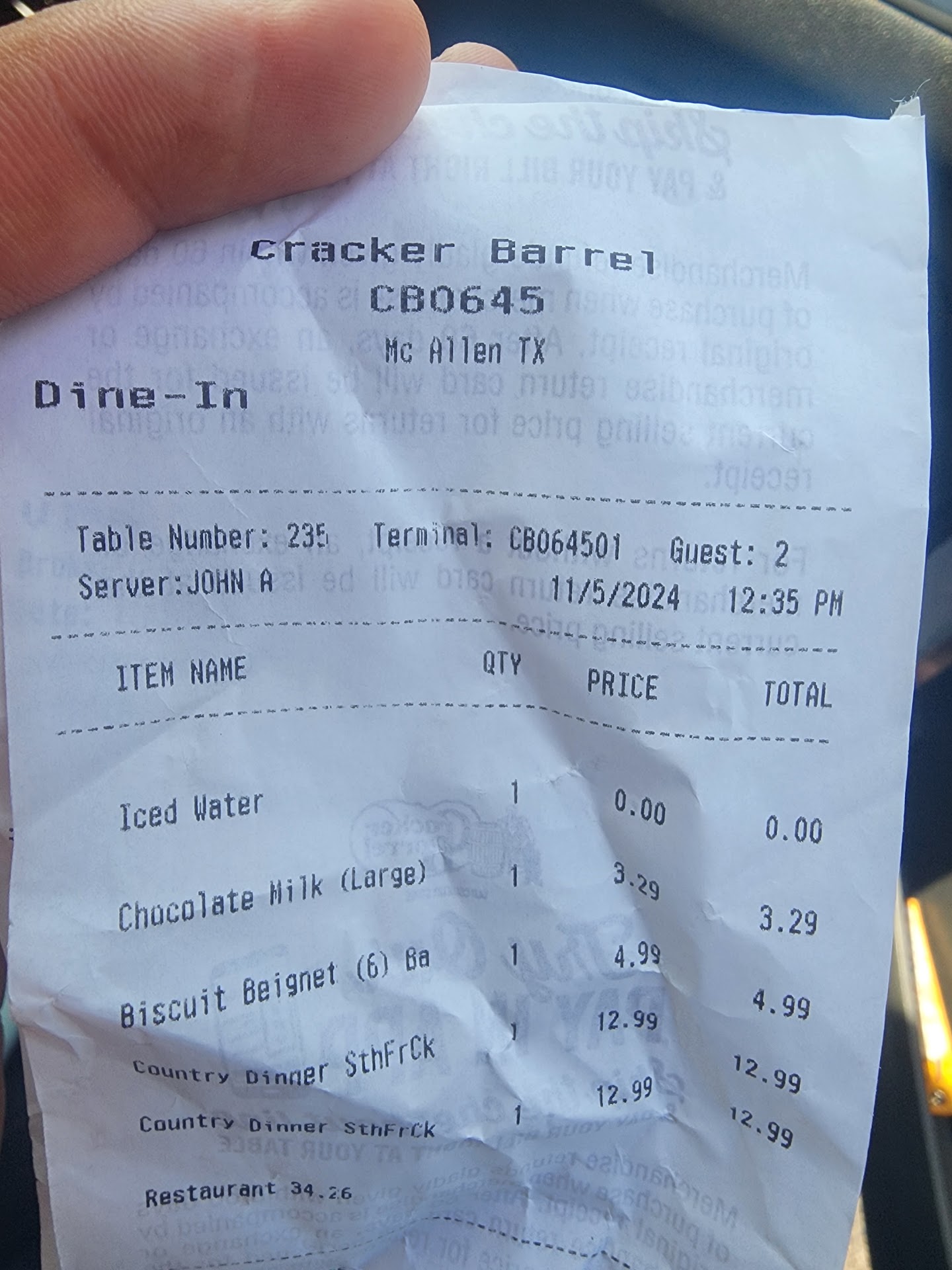 Read moreToday April 5th 2025 we headed to have a delicious meal as always at the Cracker Barrel in McAllen Texas off the expressway. Well, today was the worst ever!! First, we were sat in an area where there was a loose board on the roof that looks like it was about to fall and we asked to be moved. The manager Rick even took pictures. Second, one of our orders the eggs were ordered over hard, and they brought us scrambled. I called the waitress and she took the plate to correct it. They bring back the same eggs style. I called the waitress once again and then decided to show her an image of over hard eggs and she said she had never seen those. Which is fine, we told her it was ok just showing her how we initially wanted them and we kept the scrambled eggs. Third!! I order the chicken fried steak and eggs, ate about half and all is good until I bit into a biscuit and it was completely raw in the middle. I spat out my food on a napkin, called the waitress, we open the 3 other biscuits show her how they are completely raw as well and she apologized and took my plate. About 20 minutes pass and she just brings me my check. So I called the manager “Rick” very rude by the way, and I asked him where my food was? He says, “Well you complained about the biscuits and we saw they were raw, but the biscuits are free! We don’t charge you for those.” That made me upset, to which I replied to him, “Sir I am not here for a free meal! It was obvious what my concern was, but if that is how you do business, where you don’t even apologize to your customer, just ignore me for 20 minutes, you had my plate removed and then you only bring me my check and then hope I just go away?!?! Then thank you for the worst service ever!” My total was originally $52.00, and when the cashier rung me out it showed $33.00. I told the waitress I wanted nothing for free and I wanted my original receipt so I could place a complaint and she just smiled and said, “Sorry I already...
