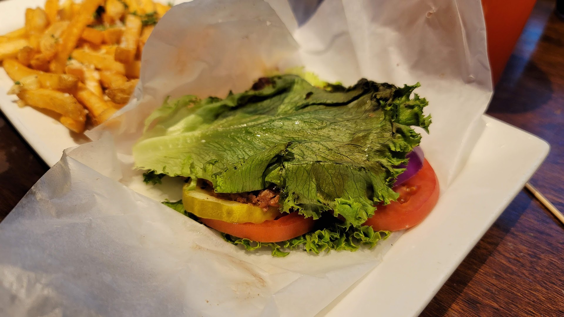 Is this burger worth $15? I don't think so. My dining experience at Dave and Buster's was a huge letdown. The lettuce bun, in particular, was a perplexing choice that didn't work at all. We had chosen this restaurant based on online information about various vegan options, but the reality was quite different. Supposedly, all Dave and Buster's locations should offer a wheat bun without egg or milk, but this particular one did not. This was a disappointment, especially considering the number of people with egg or milk allergies.