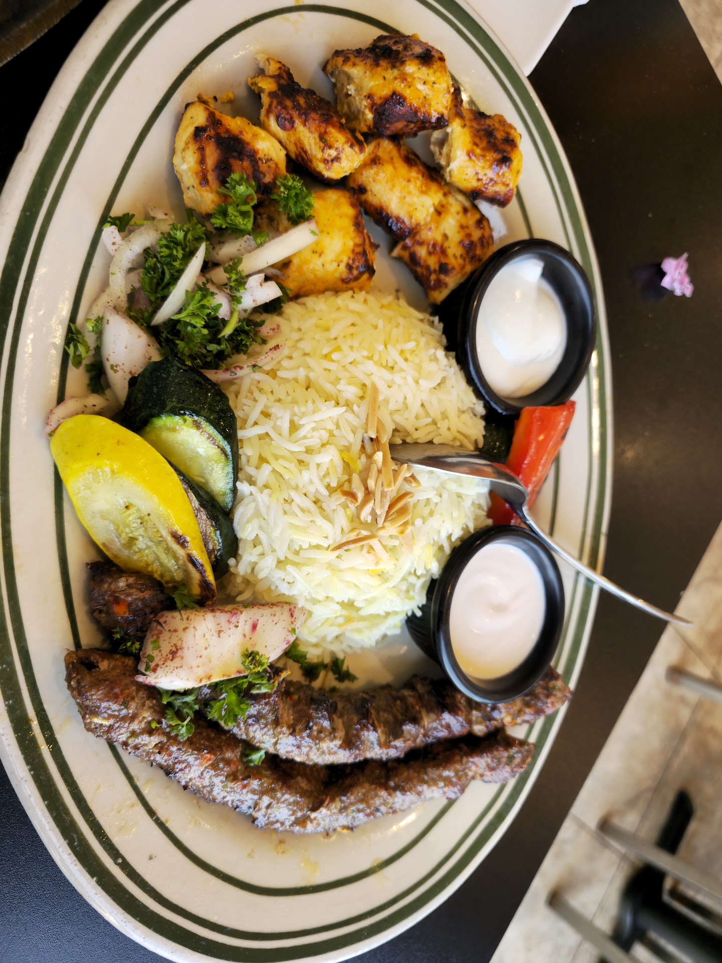 We got the Fares platter for two, believe it had probably the best pricing for two people which includes two meats, three cold mezzes, a salad and pita bread, which also includes rice and veggies on the plate.