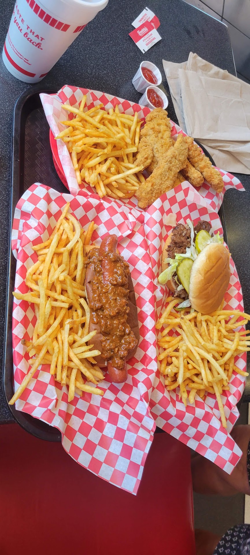 Read moreHave been to a few Freddy's elsewhere. Since we arrived the place seemed a bit dirty and floor was sticky around chair tables. We just thought they had finished a rush at 4pm Sunday so it might be justified. We ordered 2 doubles and a kids chicken menu. Wife said her burger was salty, tasted hers and it was very salty. Had mine was salty but kind of washed it out with a lot of sauce. We're not picky eaters. My little one started off with fries which were a tad salty but I guess u can expect it on fries. When she tried the tenders she spit it out. I tried one myself and again was VERY salty. I just let the girl at the counter know that I've been to Freddy's around Houston and this was nowhere near the quality I'm used to. I never ask for refunds just unfortunately we won't be coming back even if it might have been a bad day. Did let them know and I hope management can do something about it for...