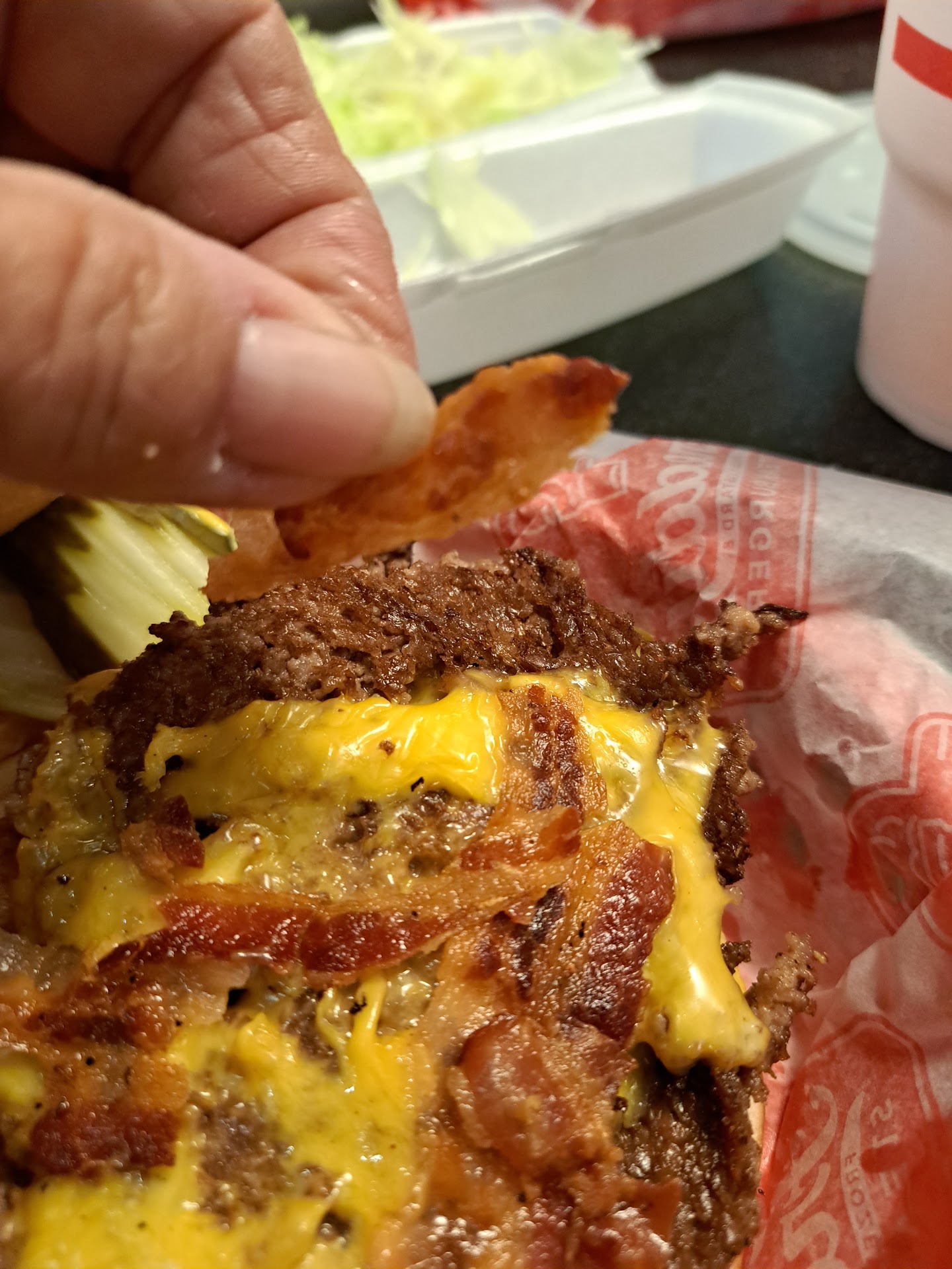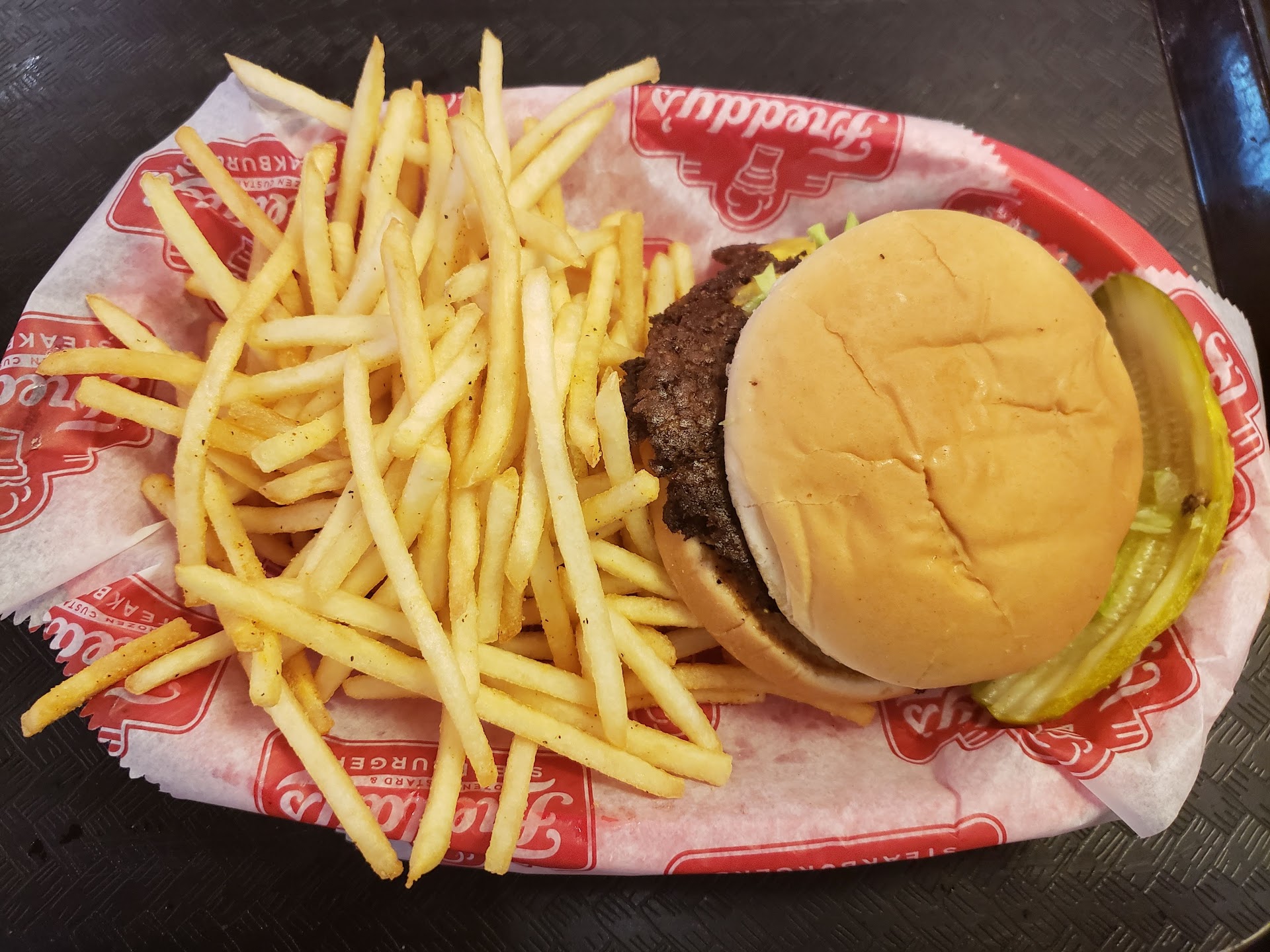 Read moreBeen here a few times and it's been consistently good. The prices are on par with similar types of restaurants and the menu is simple: burgers, dogs and custard. On this particular visit in had the double patty with bacon combo. As seen in the picture the patties are somewhat similar to Five guys in that they are smaller, thinner than a burger from, let's say Wallbangers. Not pictured is the bacon they forgot to add but one word with a staff member and it was brought to me within minutes. The patties are small but they are juicy and flavorful and the bacon was nice and crisp, not over done. Regarding the fries, they are thinner than most places but they are crisp (my preference) and are seasoned with Freddy seasoning. For extra flavor grab some special sauce that can be used as a condiment on most anything except the custard. Not sure that's a great combo. Split a custard with the family because having one by yourself after a filling meal may put you in...