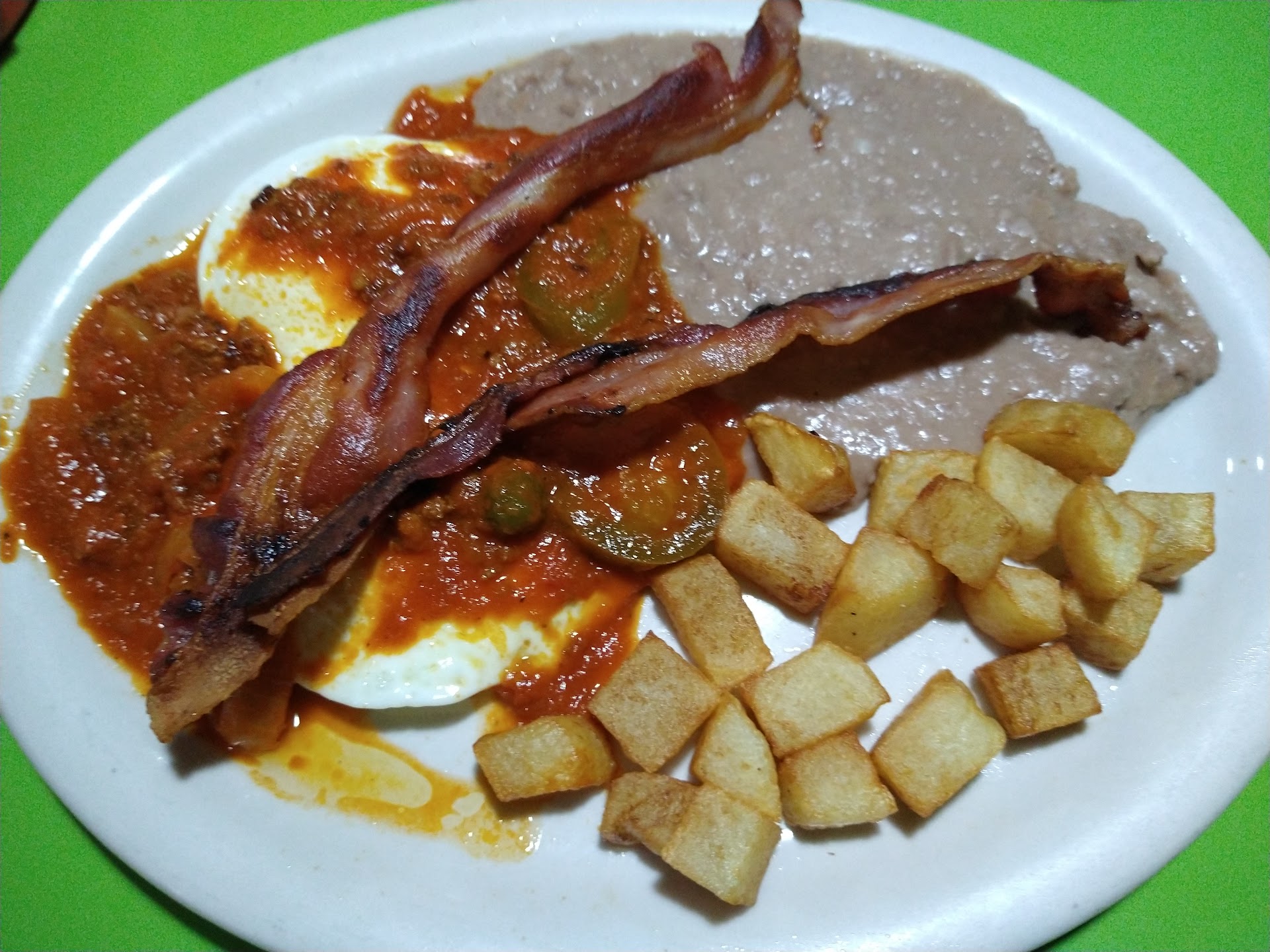 The eggs were perfectly cooked over medium, the salsa for the eggs was very tasty, the potatoes were made fresh to order crispy outside, the beans had a good taste home made flavor, the bacon was thin and crispy.
