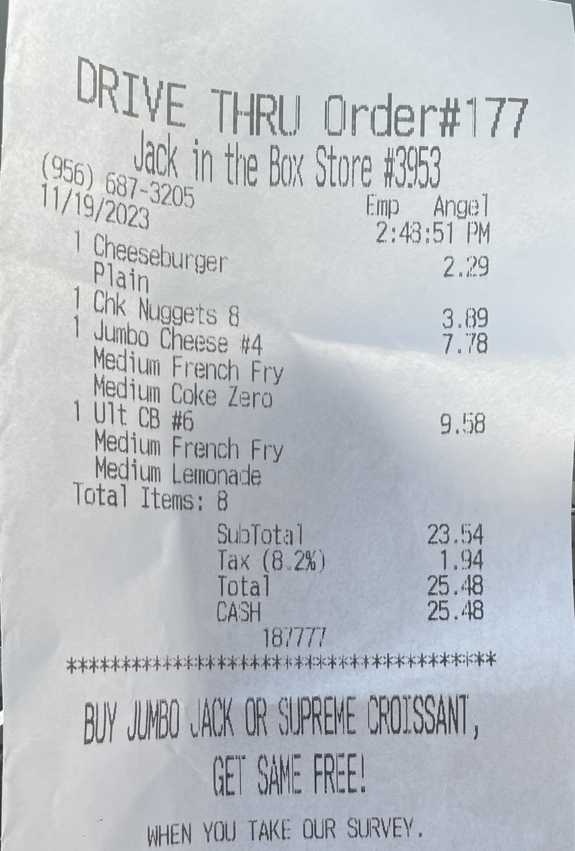 Dear Jack In the Box Manager, if you're reading this, you're the man and I owe you for helping me make ends meet till the next paycheck which fortunately arrived today.