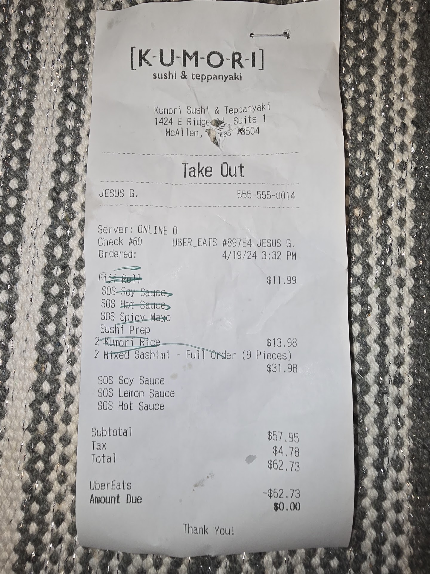 It's disappointing to see such a decline in service at a place I used to love. Unfortunately this location and the one at the mall where a hair turned up in my roll, are not options for me anymore. I hope Kumori management takes these issues seriously and makes the necessary improvements. Loyal customers like me...