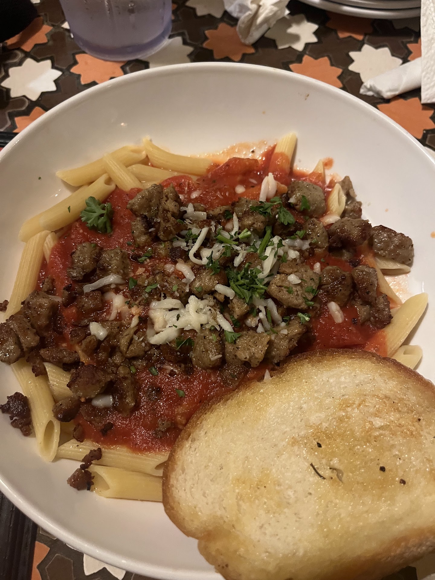 The young waitress was polite and friendly when she came to take our drink order. She offered to submit an appetizer request while we decided on a main course and I decided on stuffed mushrooms. The young miss returned a couple of minutes later with our teas and took our final order. We had requested a pepperoni pasta dish to share, and within 10 minutes the mushrooms had arrived. They were arranged geometrically on a decorative plate lightly drizzled with a rich sauce I found comparative to a thick Worcestershire. Although it was a grand start to the meal, it was the last time we saw our server outside.